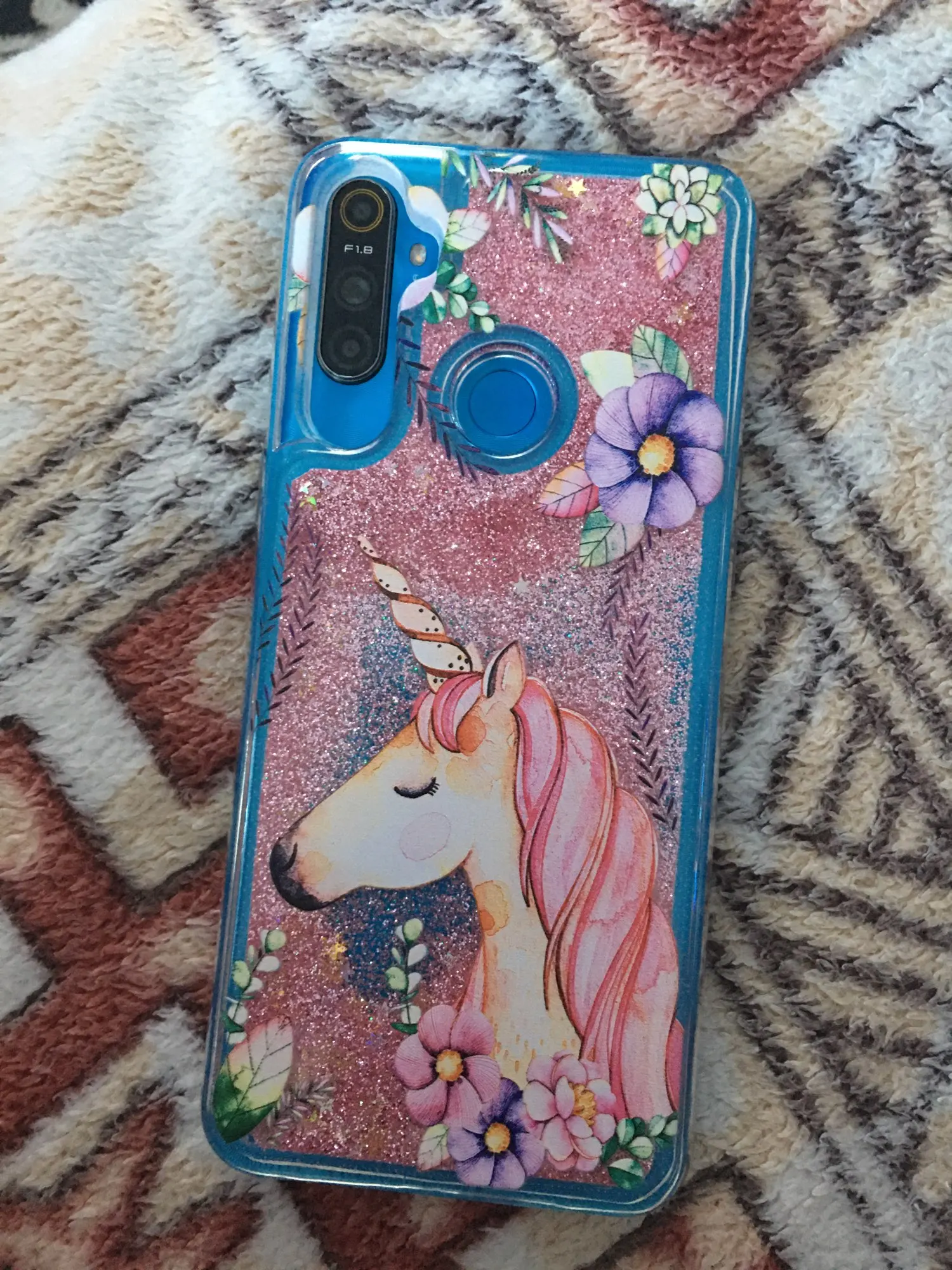Чехол просто шикарный! Я влюбилась в него с первого взгляда! Очень блестящий, блестки переливаются, плавают, единорог точно пропечатан, без пятен и царапин, цвета картинки сочные, не блеклые. Заметила, что среди блесток есть маленькие сердечки и звездочки это очень мило. На красном телефоне смотрится отлично! Большое спасибо!