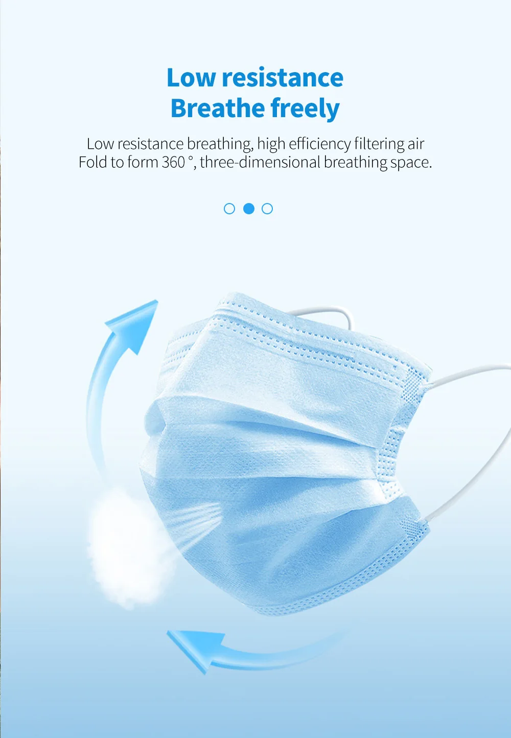 1. Новая ткань PP Нетканая ткань, мягкая и чистая, удобная и дышащая 2. Процесс бесшовной вязки 3. Три раза дизайн, больше дышащего пространства на лице 4. Пластиковая полоска для носа, алюминиево-пластиковая полоска для носа, 5. Многослойная защита для вашего дыхательного здоровья