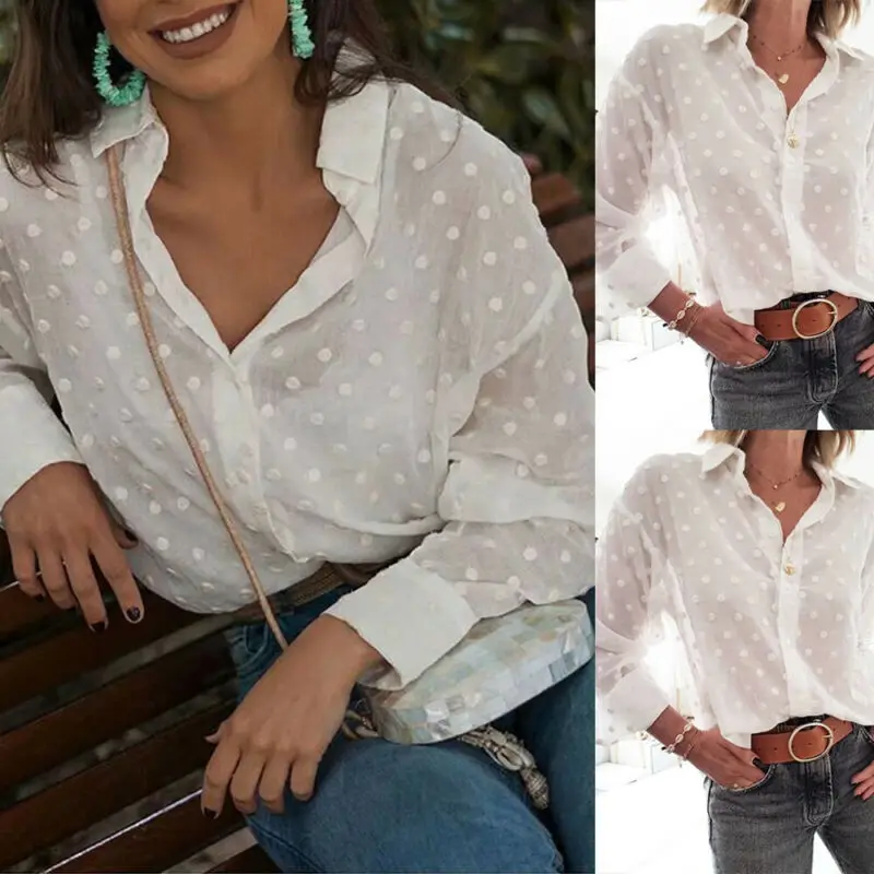 Женская прозрачная блузка в горошек, свободная белая блузка с длинн...