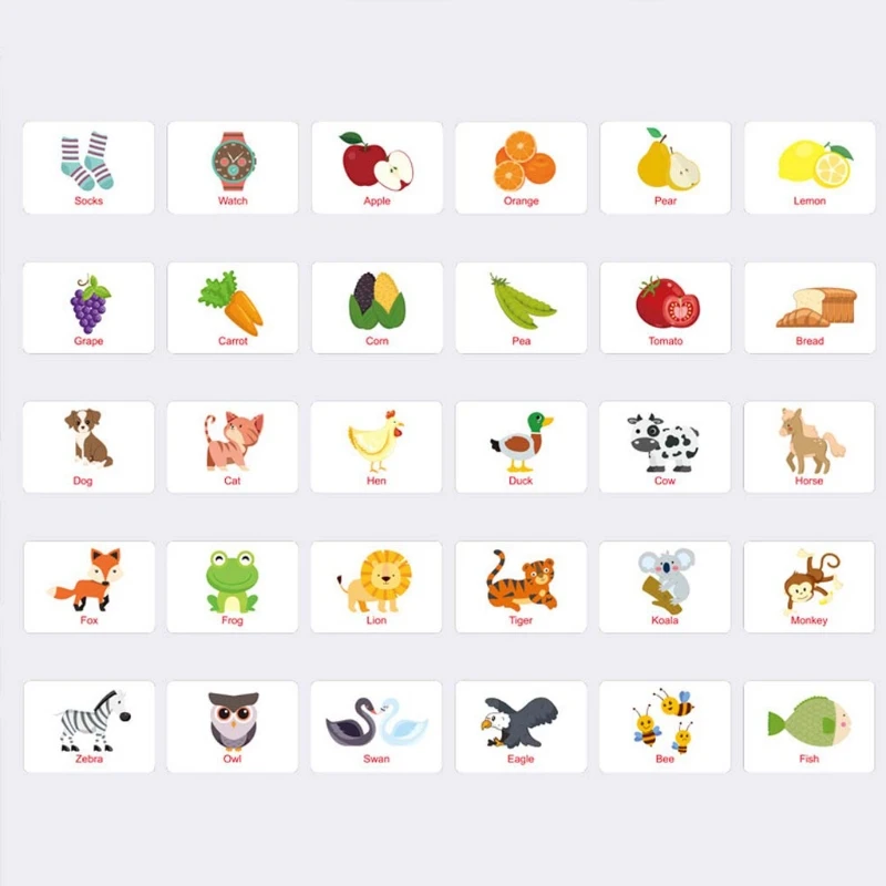 Прочный ящик для хранения содержит 78 букв (2 набора строчек, 1 набор верхней части корпуса), 20 цифр (2 набора 0-9), 7 математических символов, 5 значков погоды. Создано 60 милых иллюстраций на 30 двухсторонних картах, включая животных, фрукты, транспортные средства и т. Д.