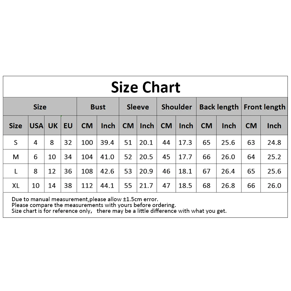 [Наш Размер S] Обхват груди: 100 см/39,4 дюйма, рукав: 51 см/20,1 дюйма, ширина плеч: 44 см/17,3 дюйма, длина спины: 65 см/25,6 дюйма, длина спереди: 63 см/24,8 "(прибл.)