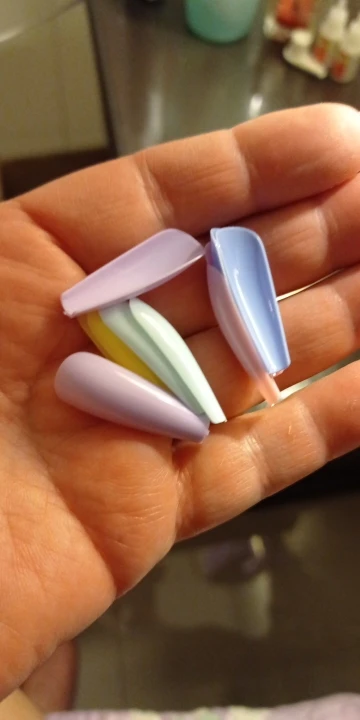 Так же, как описание. Те же цвета и размеры ... Может быть, это немного, потому что у меня есть ногти одинакового размера, и мне пришлось позвонить другим, чтобы они подходили. Он перестанет ставить их без драмы, но чтобы удалить их (если вы хотите использовать их снова), вы должны быть очень осторожны. Они могут сломаться (последнее фото)