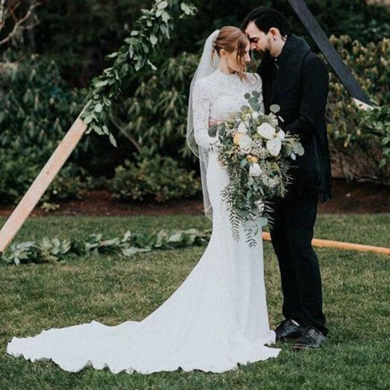 Скромные дизайнерские свадебные платья с высоким воротом и длинными рукавами, кружевные свадебные платья с аппликацией в виде русалки, свадебные платья Boho vestido de noiva