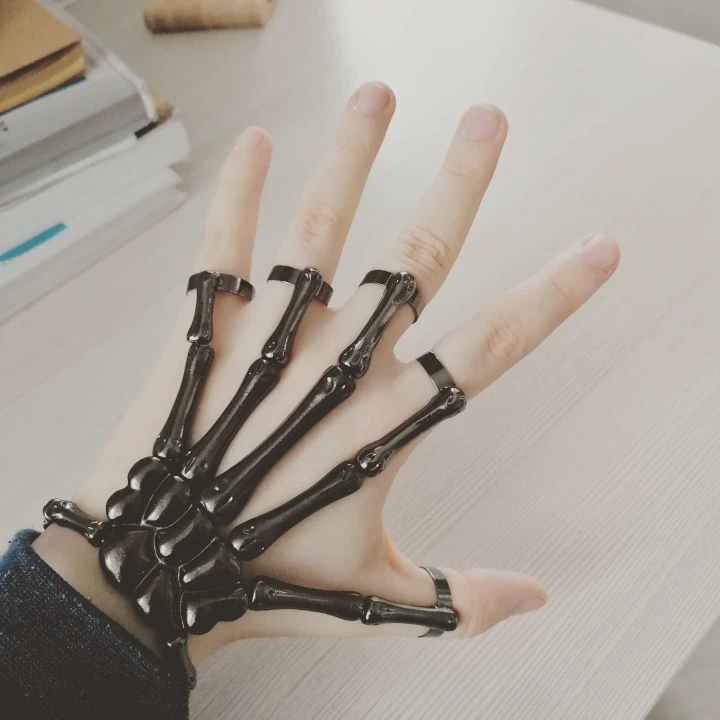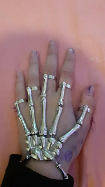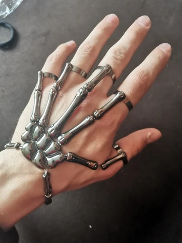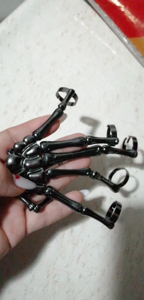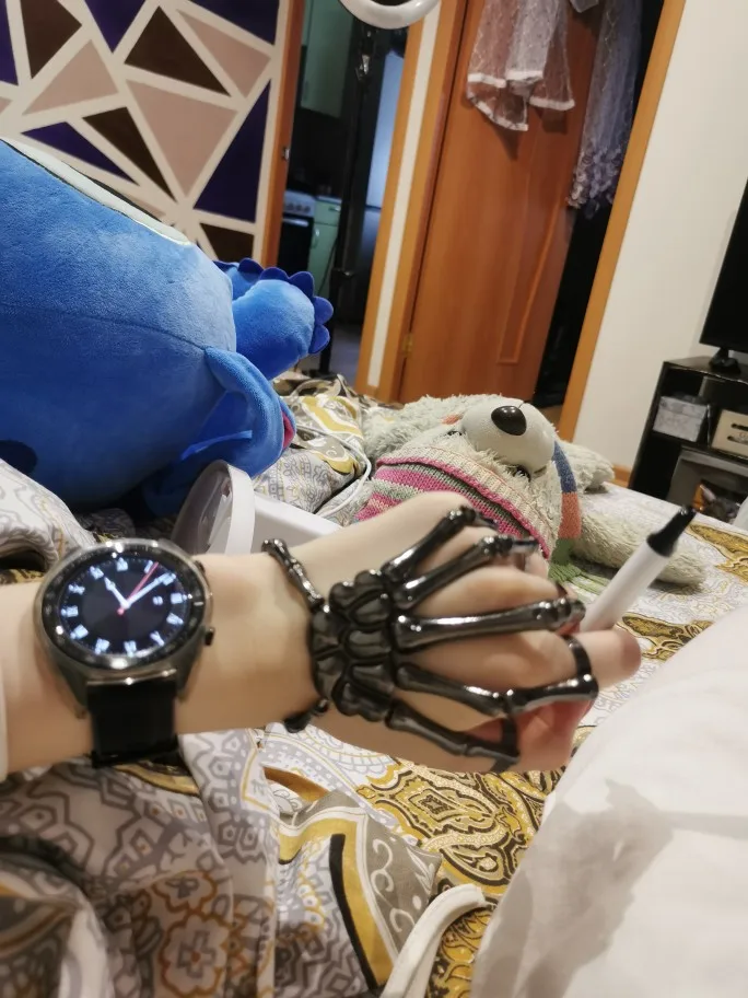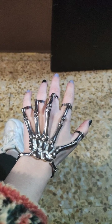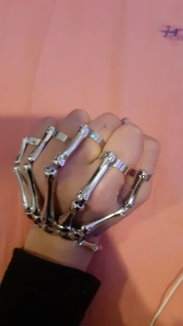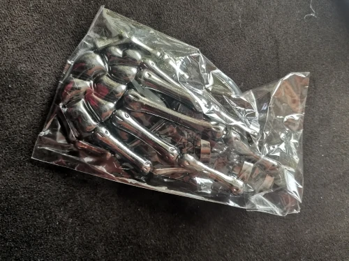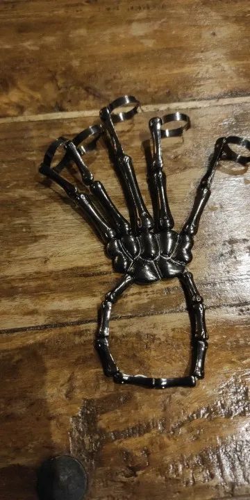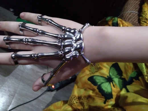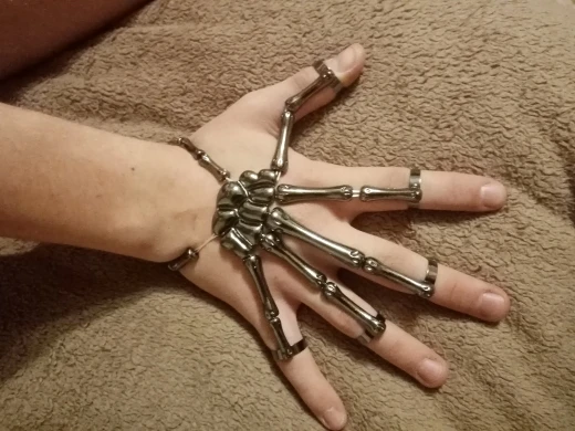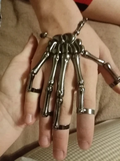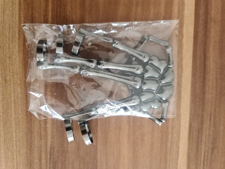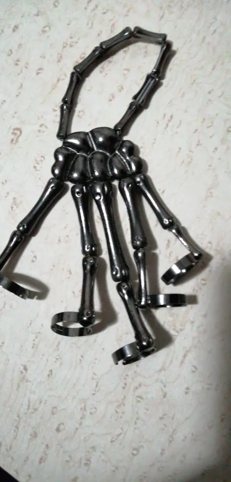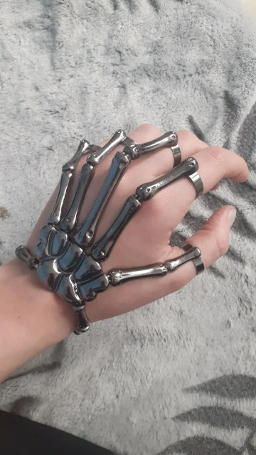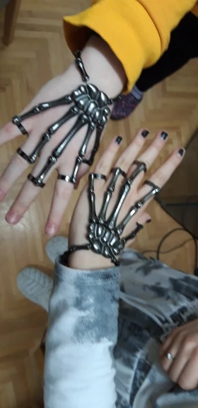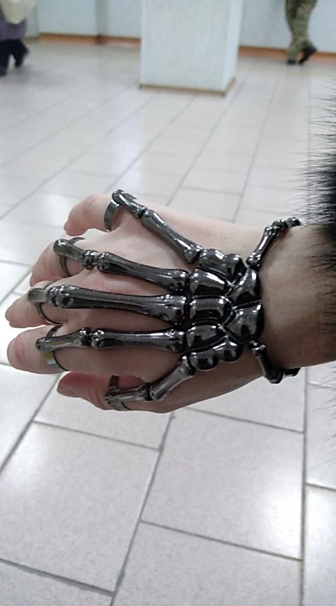 Заказ оформила 23.01, в Красноярск пришло 08.02. Прикольный браслет, выглядит круто, на маленькую руку самое то. Изнутри полый, звенья скреплены резинками. Кольца на пальцах разжимаются и регулируются по размеру. Правда они немного цепляются за окружающие предметы, поэтому для постоянной носки навряд ли подойдёт. Учтите, что два крайних звена ("пальца") разной длины, поэтому лично у меня на правой руке браслет сидит комфортнее, чем на левой.