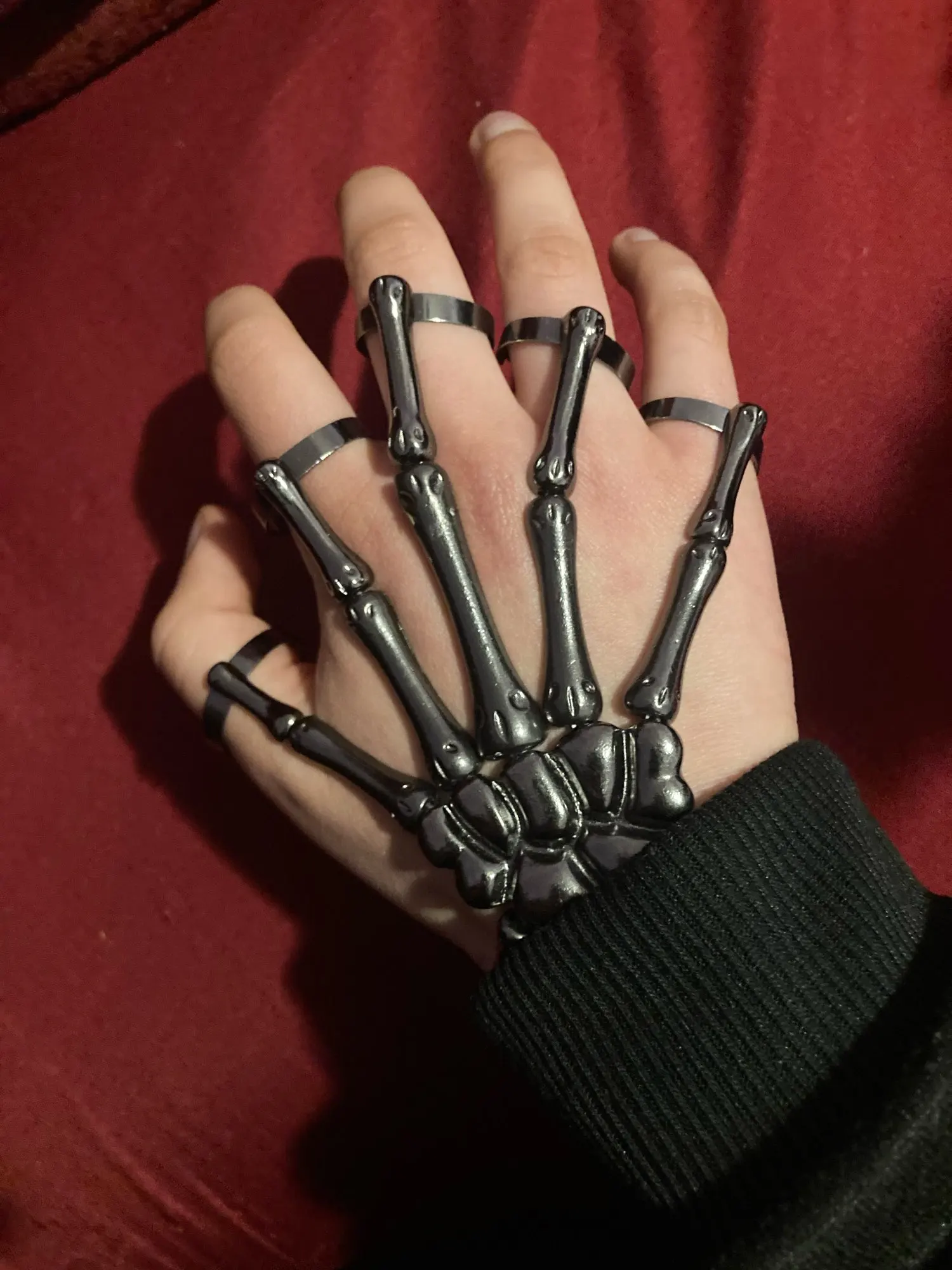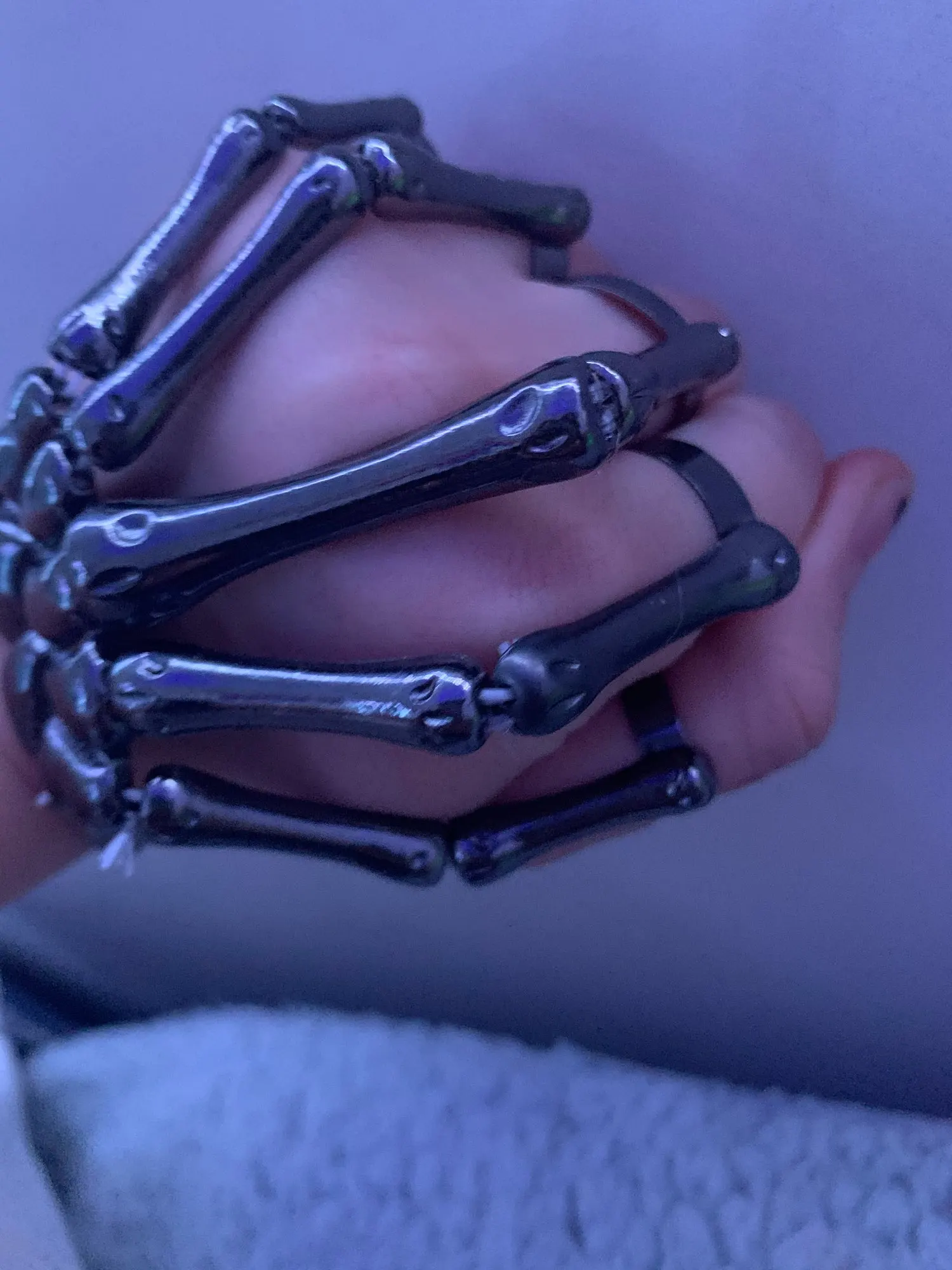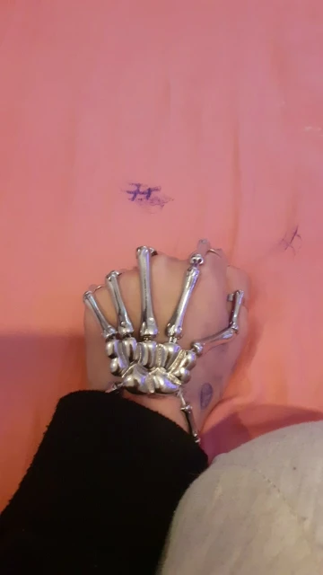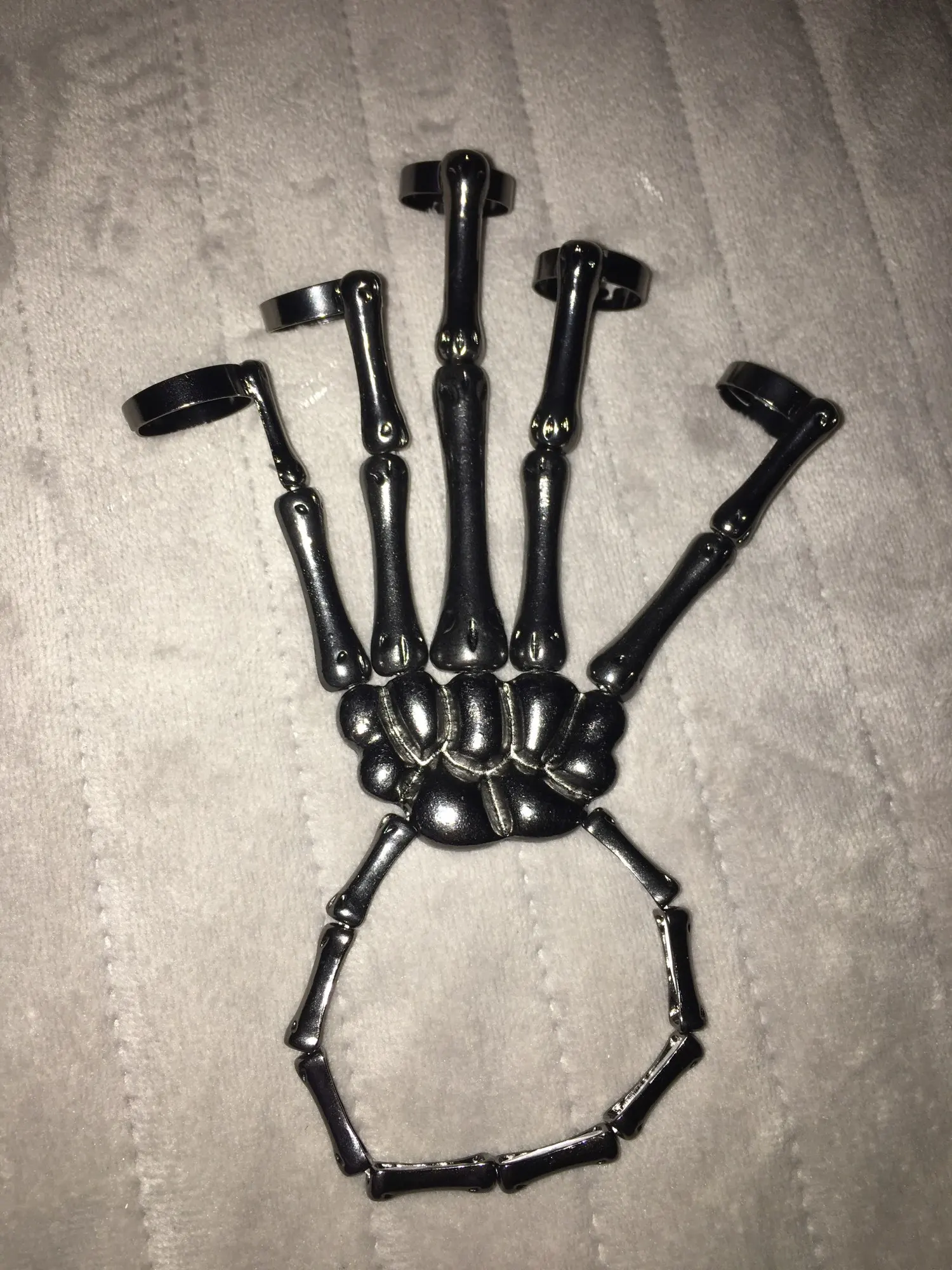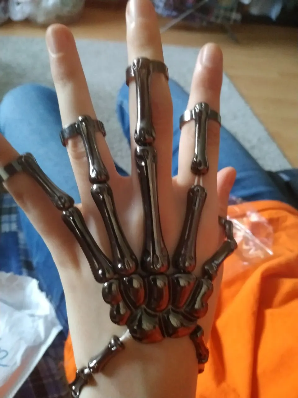 Заказ оформила 23.01, в Красноярск пришло 08.02. Прикольный браслет, выглядит круто, на маленькую руку самое то. Изнутри полый, звенья скреплены резинками. Кольца на пальцах разжимаются и регулируются по размеру. Правда они немного цепляются за окружающие предметы, поэтому для постоянной носки навряд ли подойдёт. Учтите, что два крайних звена ("пальца") разной длины, поэтому лично у меня на правой руке браслет сидит комфортнее, чем на левой.