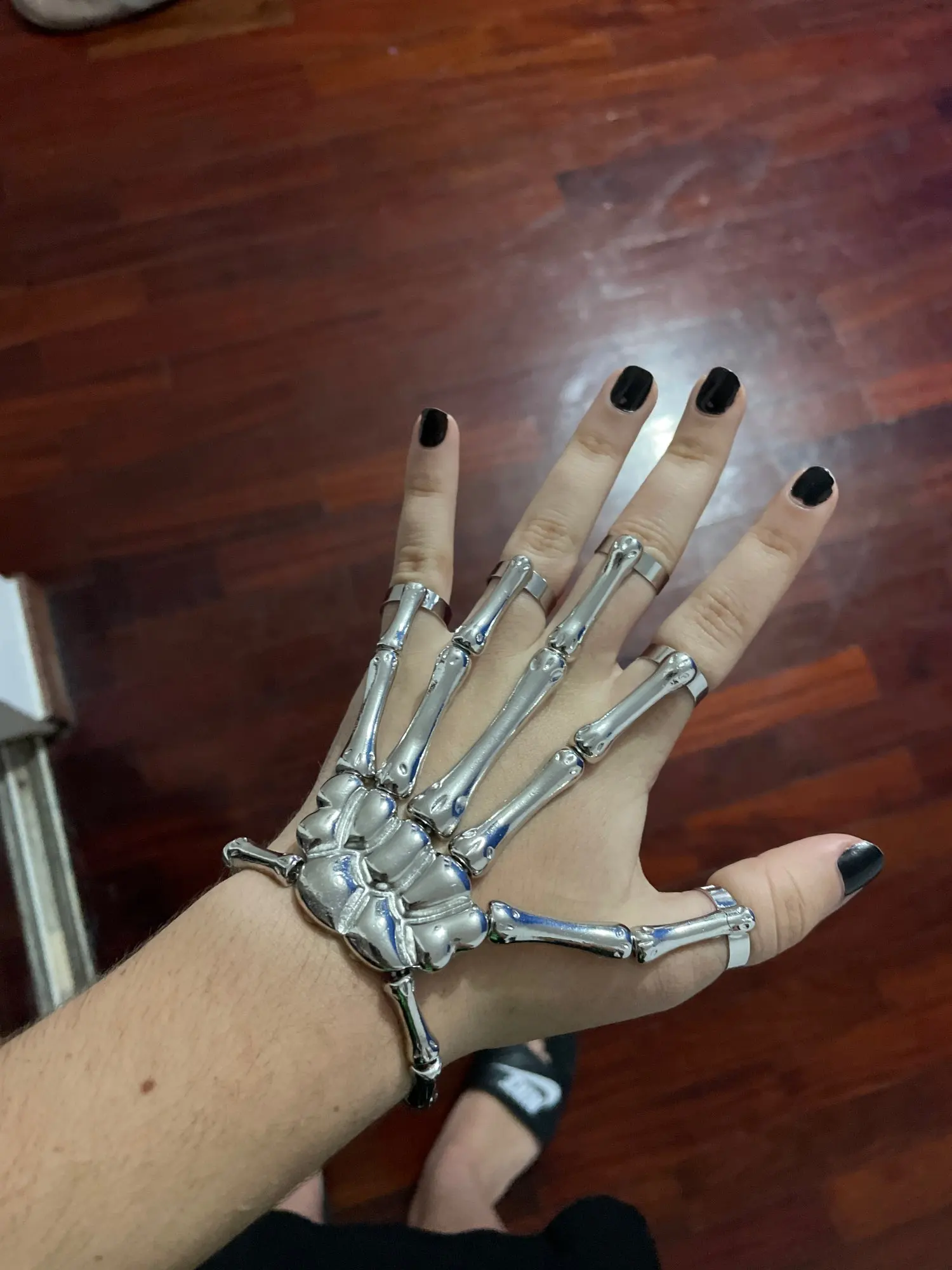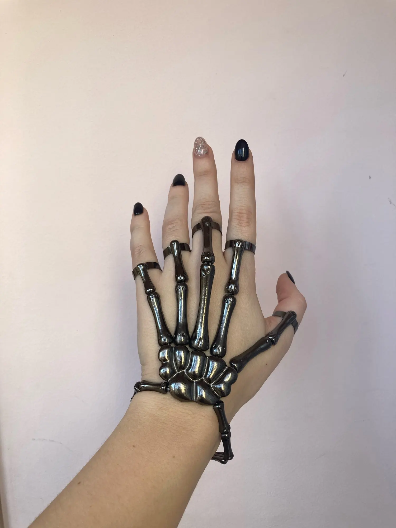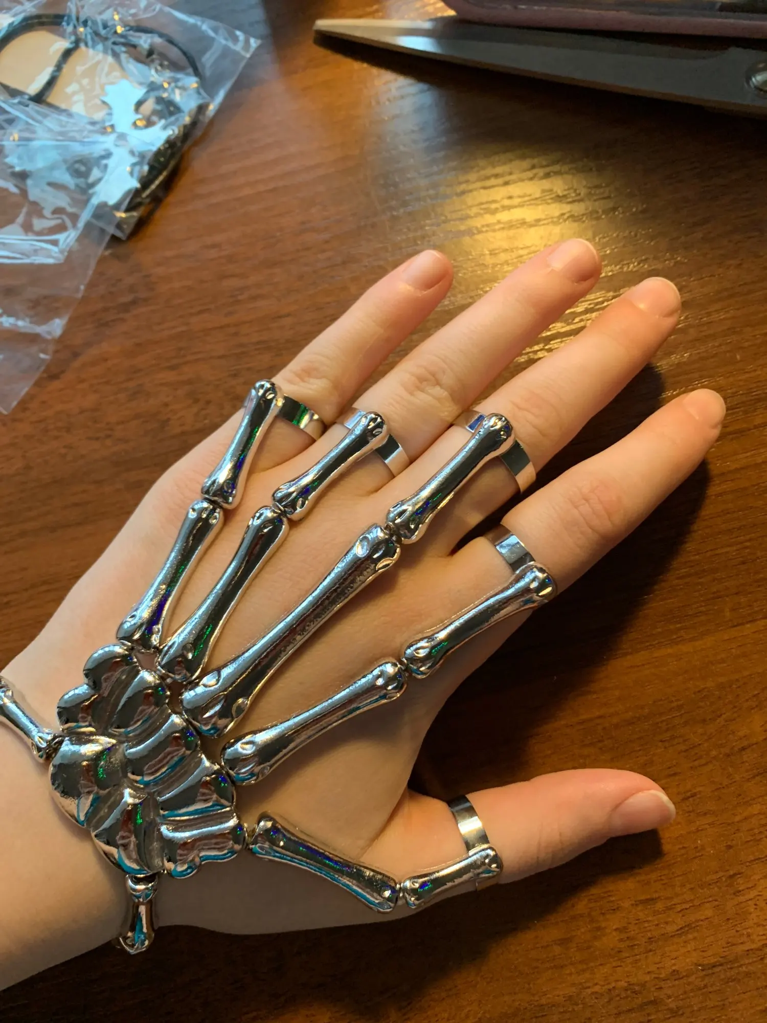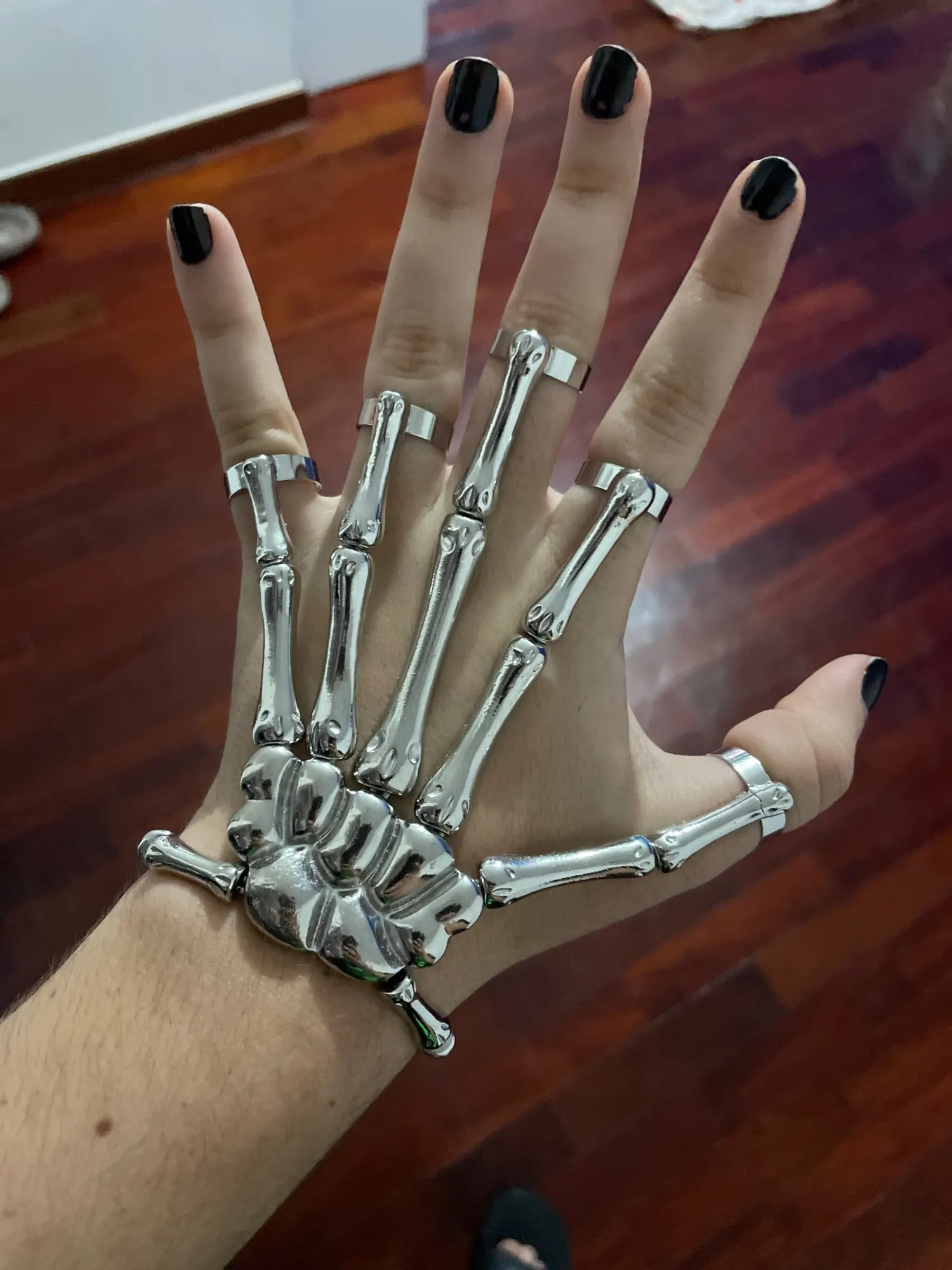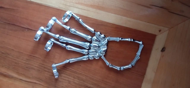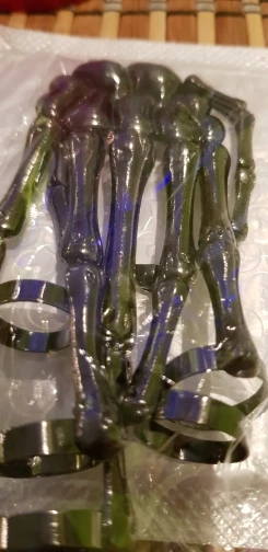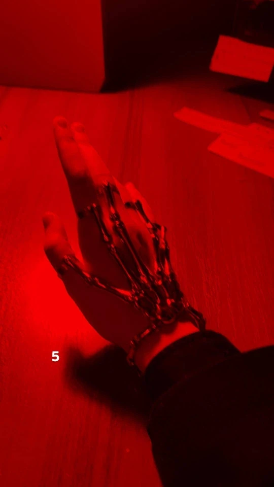Заказ оформила 23.01, в Красноярск пришло 08.02. Прикольный браслет, выглядит круто, на маленькую руку самое то. Изнутри полый, звенья скреплены резинками. Кольца на пальцах разжимаются и регулируются по размеру. Правда они немного цепляются за окружающие предметы, поэтому для постоянной носки навряд ли подойдёт. Учтите, что два крайних звена ("пальца") разной длины, поэтому лично у меня на правой руке браслет сидит комфортнее, чем на левой.