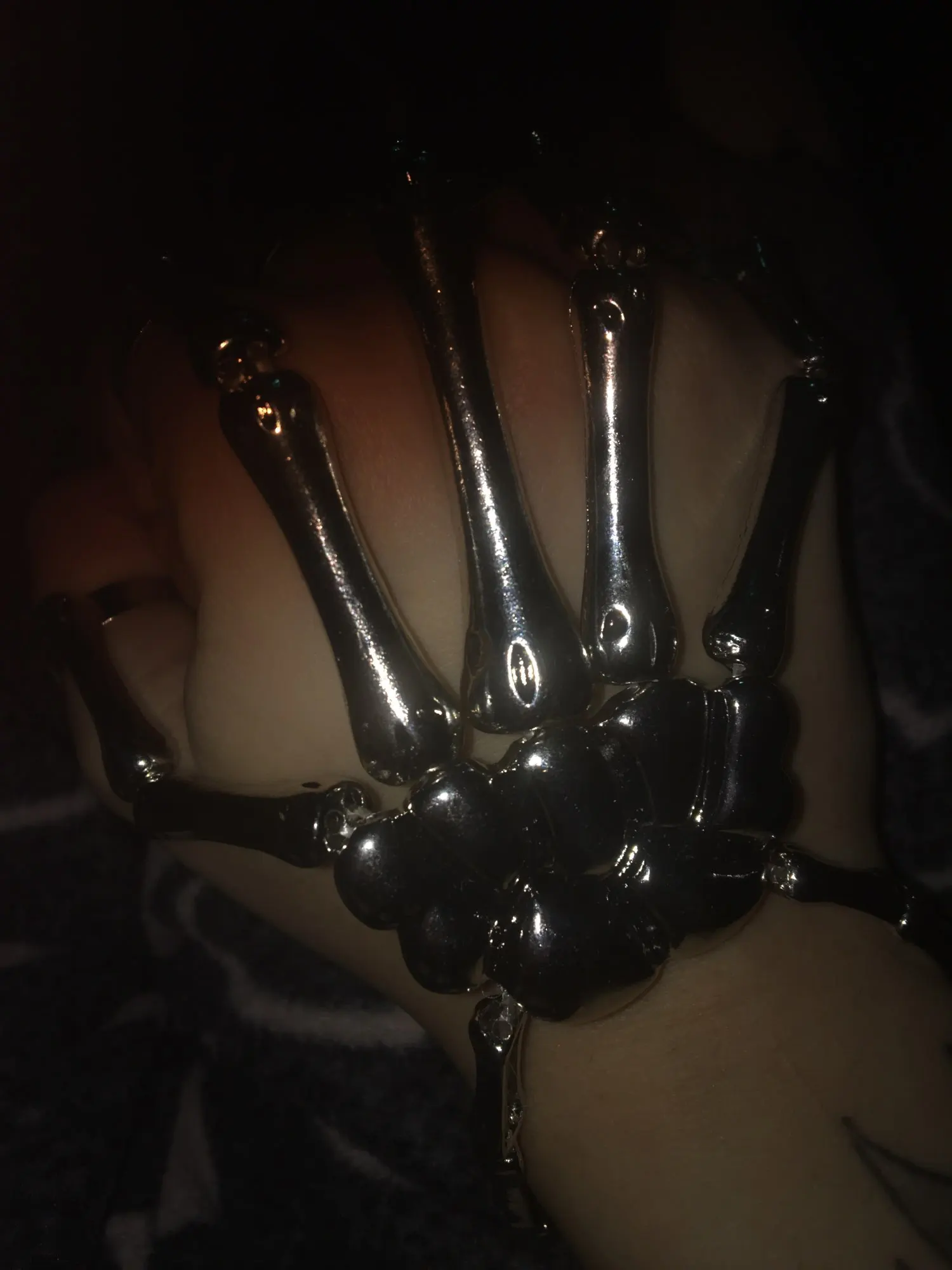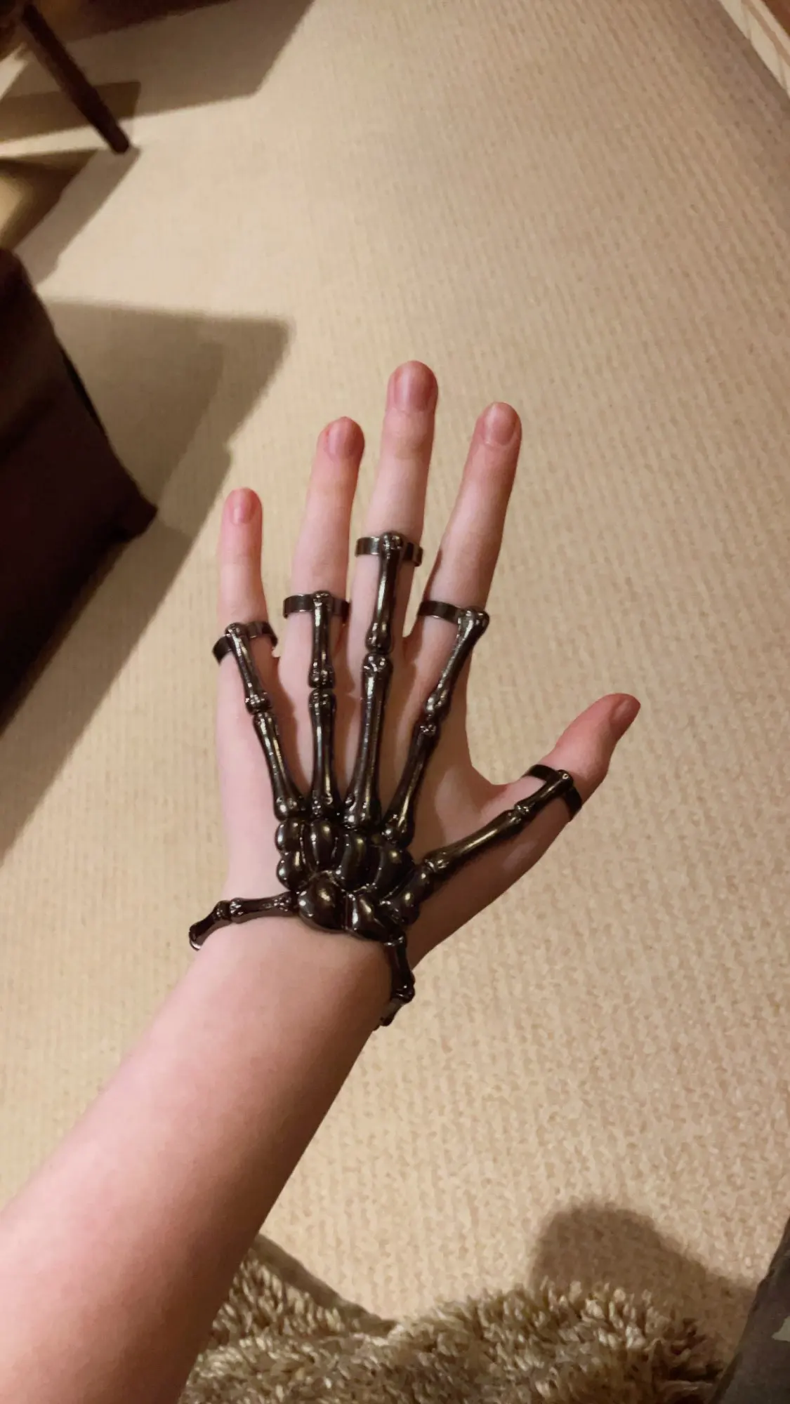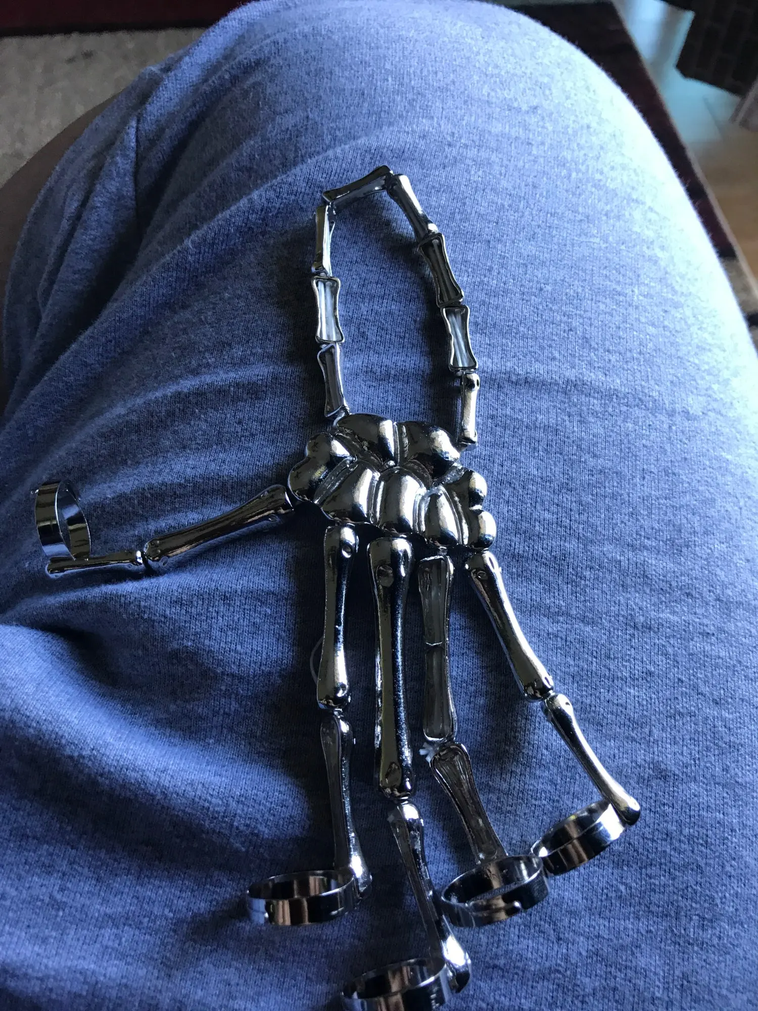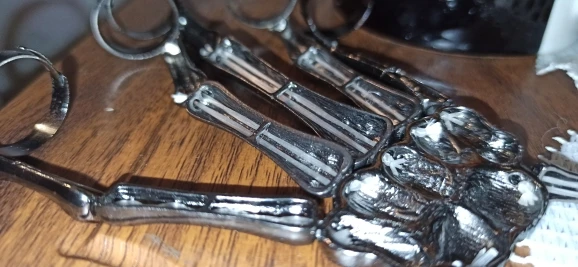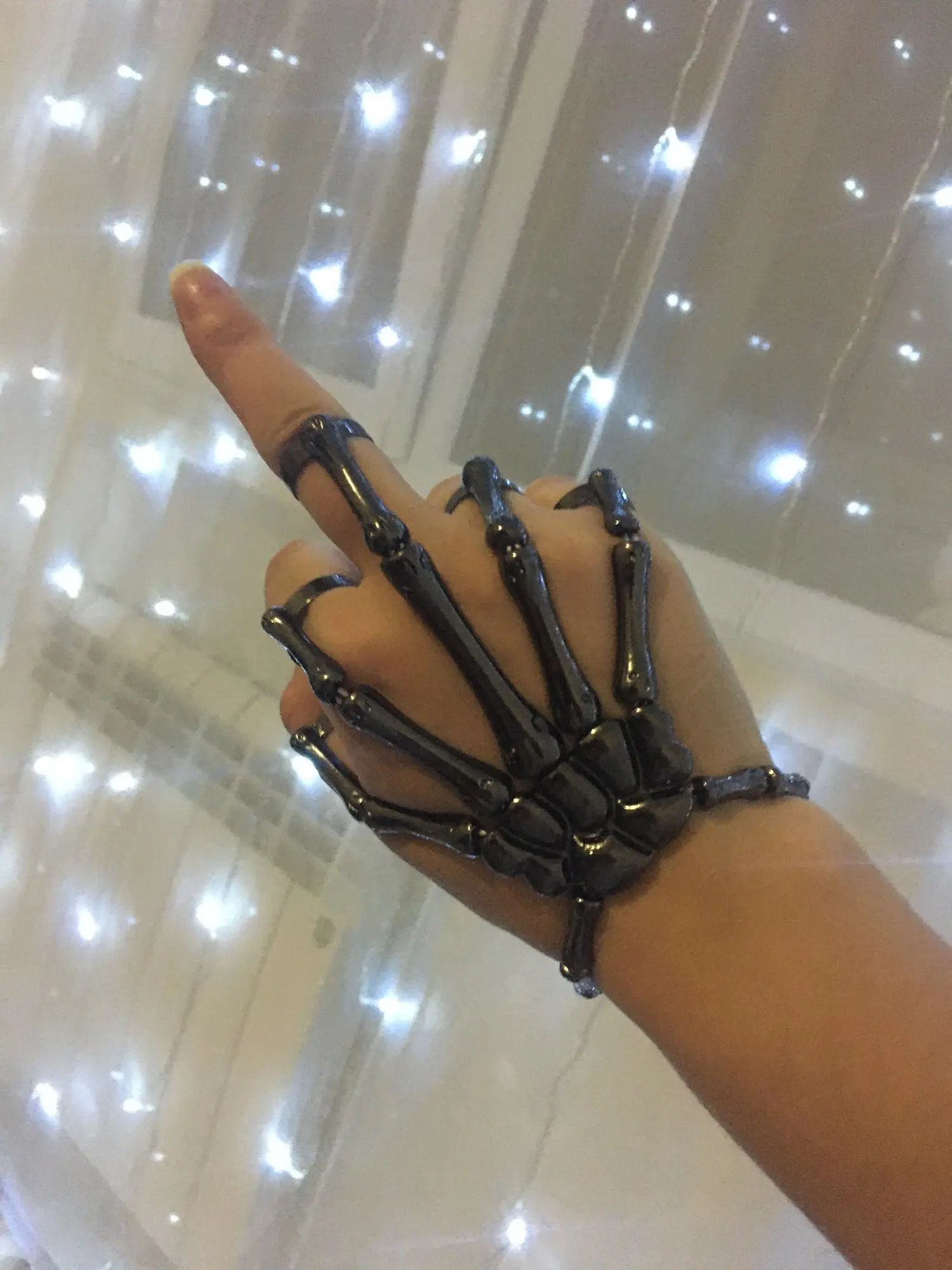 Заказ оформила 23.01, в Красноярск пришло 08.02. Прикольный браслет, выглядит круто, на маленькую руку самое то. Изнутри полый, звенья скреплены резинками. Кольца на пальцах разжимаются и регулируются по размеру. Правда они немного цепляются за окружающие предметы, поэтому для постоянной носки навряд ли подойдёт. Учтите, что два крайних звена ("пальца") разной длины, поэтому лично у меня на правой руке браслет сидит комфортнее, чем на левой.