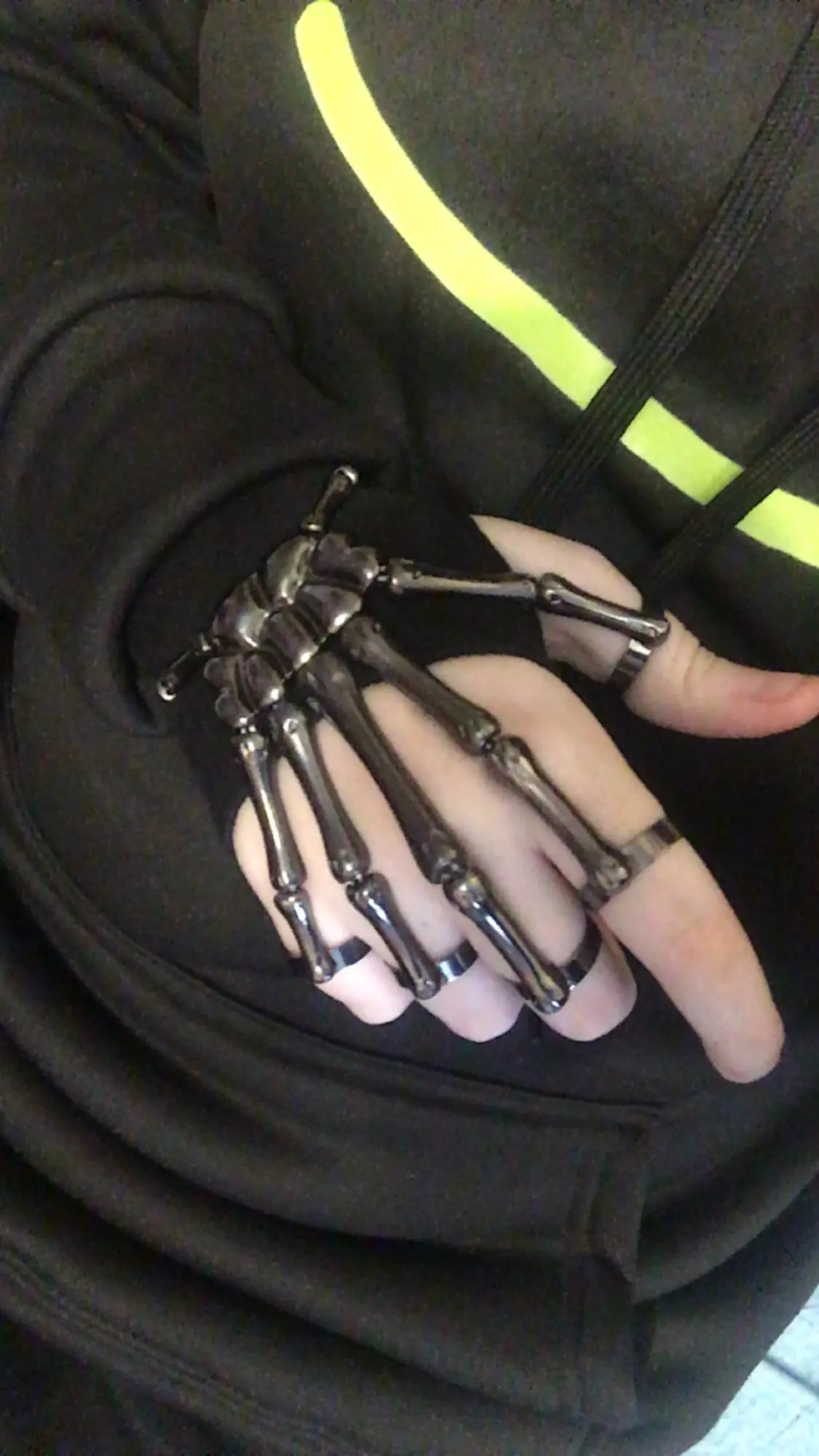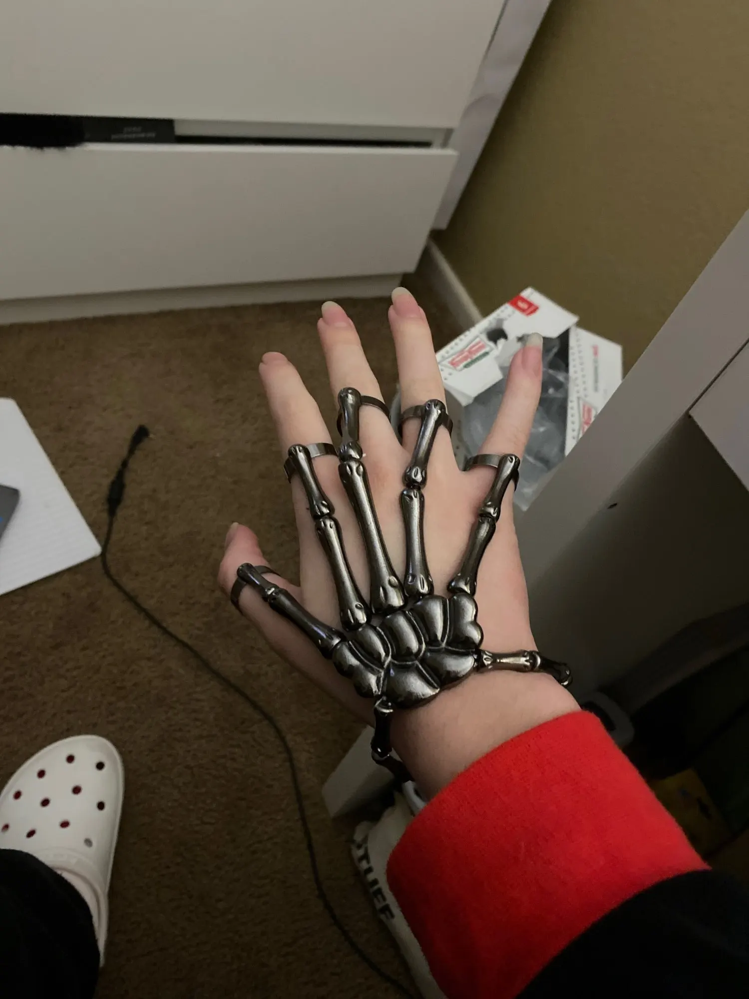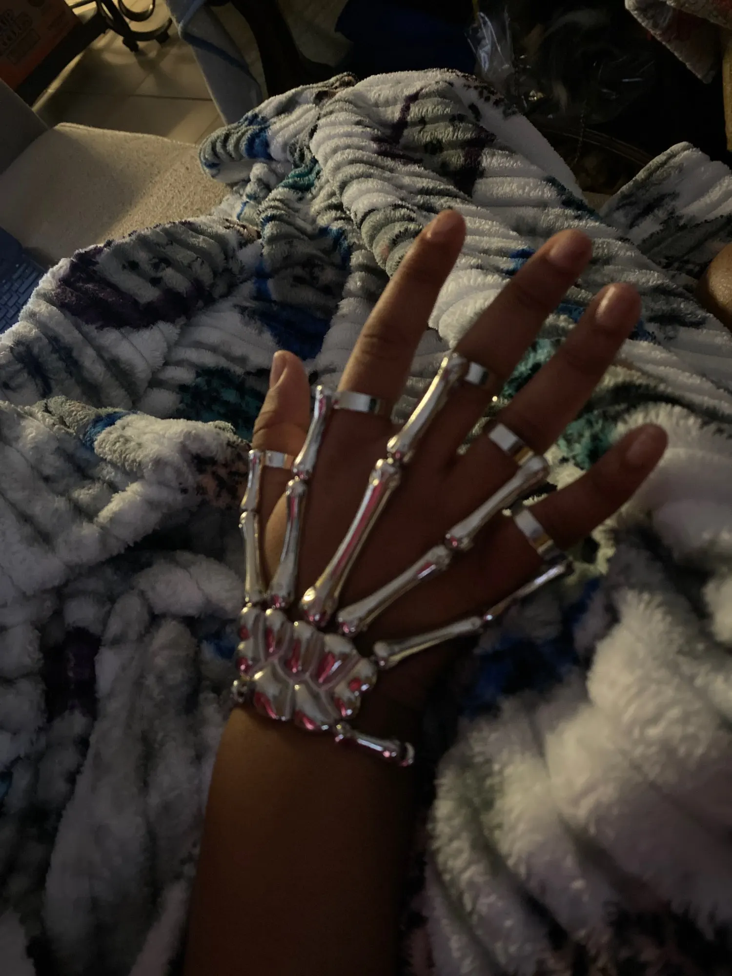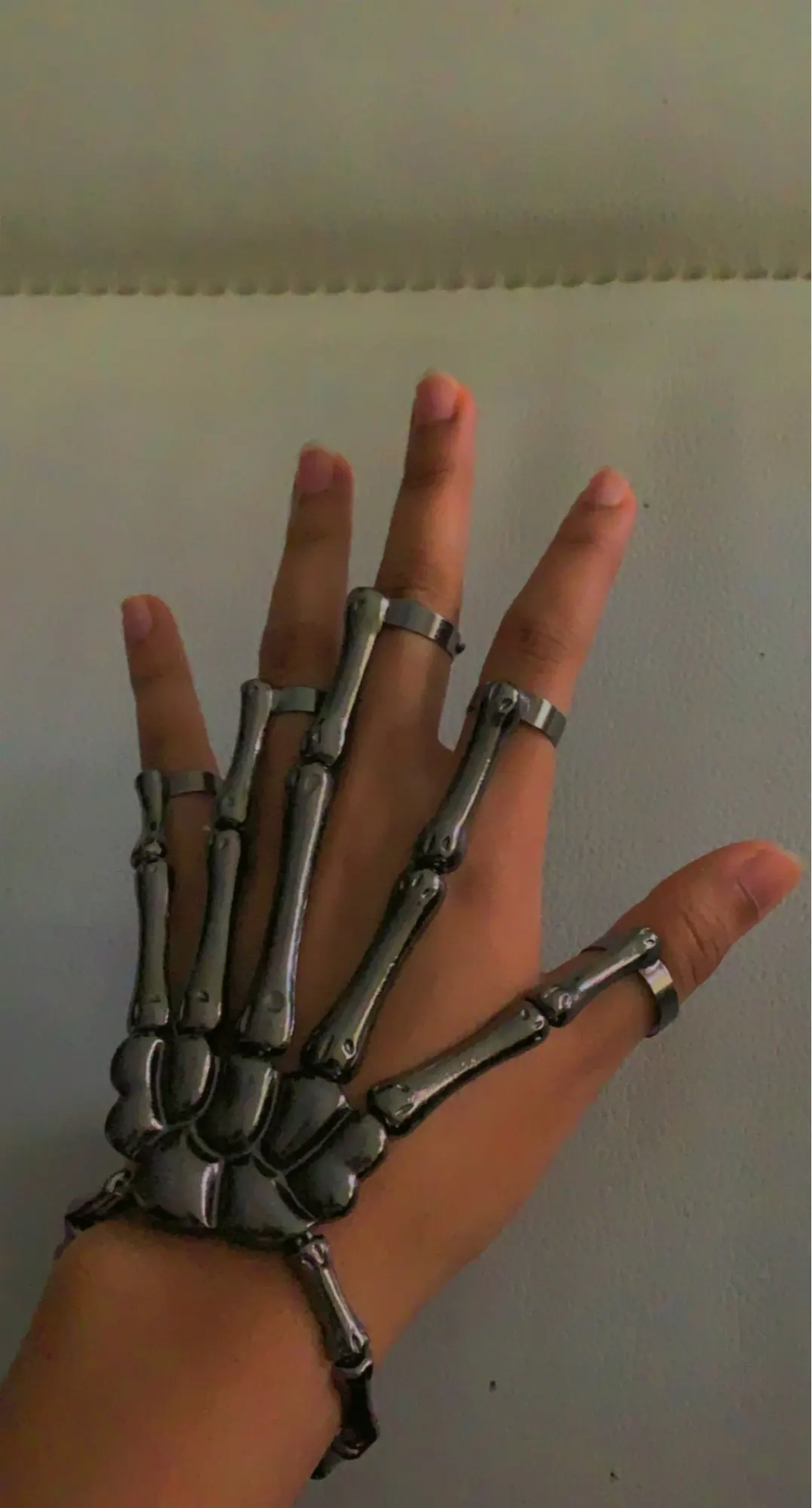 Заказ оформила 23.01, в Красноярск пришло 08.02. Прикольный браслет, выглядит круто, на маленькую руку самое то. Изнутри полый, звенья скреплены резинками. Кольца на пальцах разжимаются и регулируются по размеру. Правда они немного цепляются за окружающие предметы, поэтому для постоянной носки навряд ли подойдёт. Учтите, что два крайних звена ("пальца") разной длины, поэтому лично у меня на правой руке браслет сидит комфортнее, чем на левой.