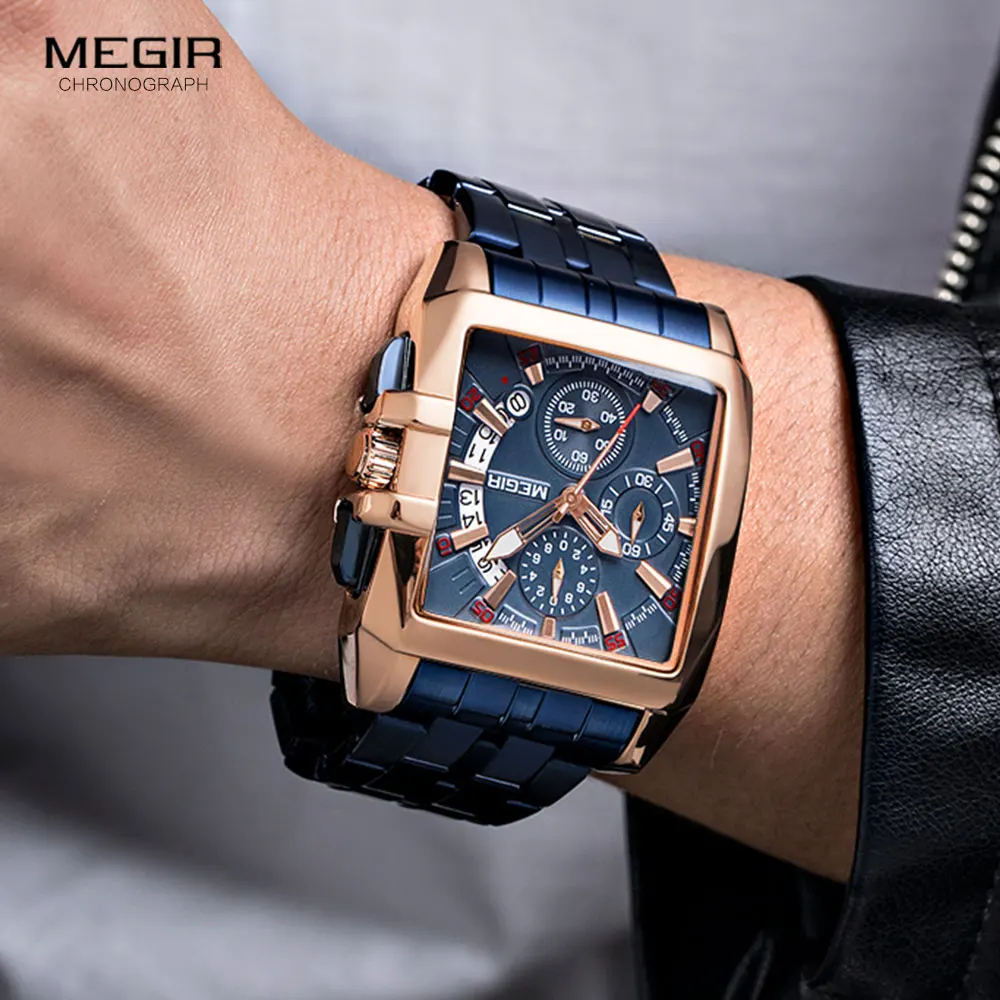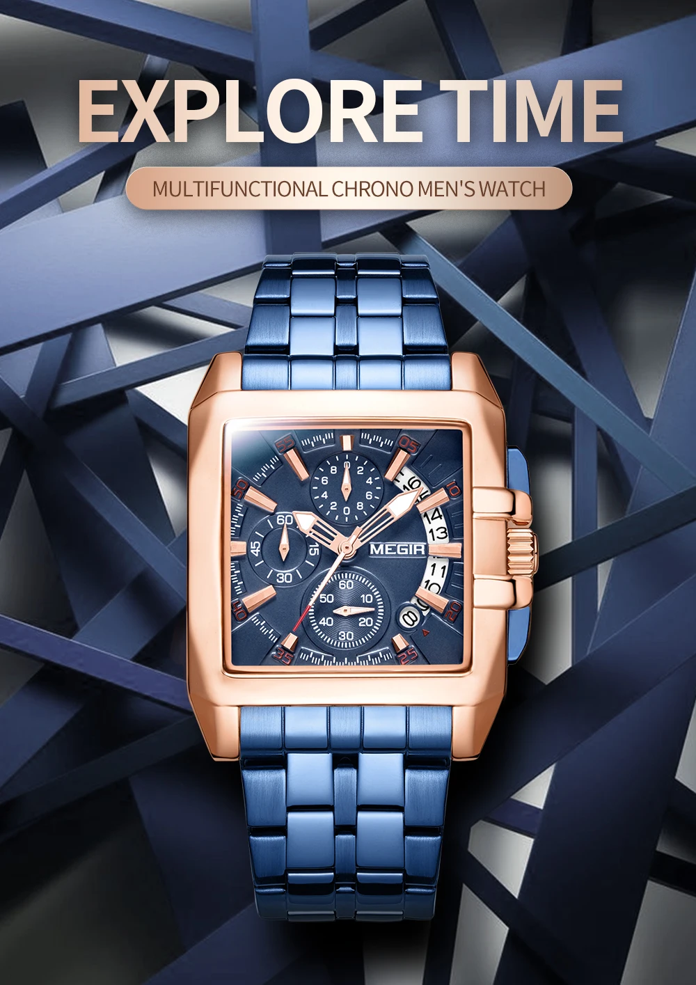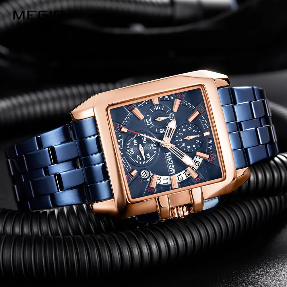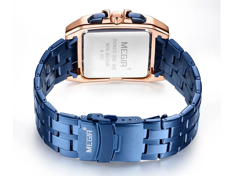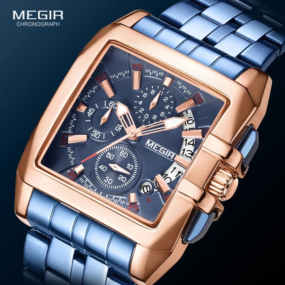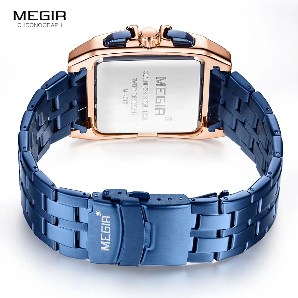Часы мужские MEGIR из нержавеющей стали, синие, розовое золото, водонепроницаемые, светящиеся, военные, спортивные