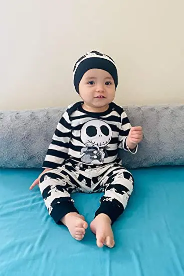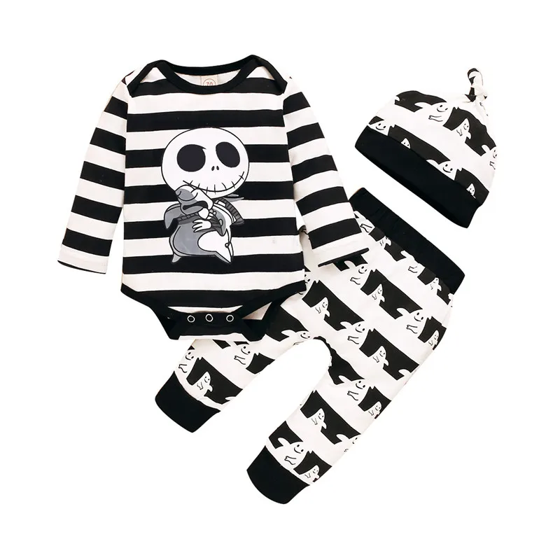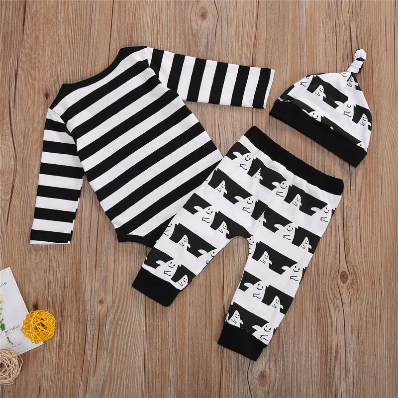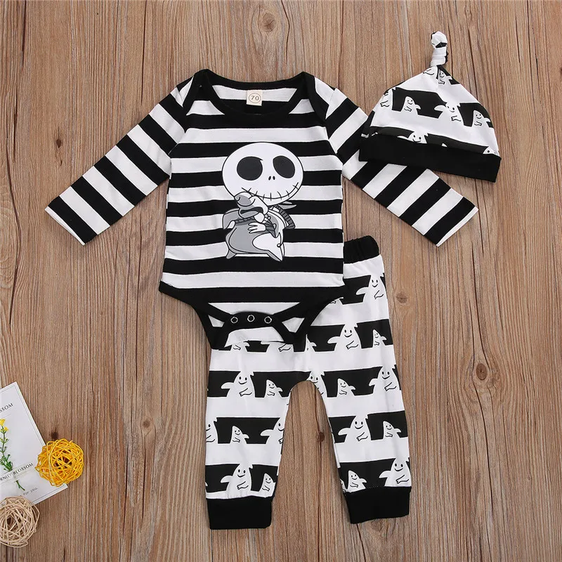 Комплект одежды из трех предметов для маленьких мальчиков, уникальная полоса комбинезон с длинными рукавами + эластичные длинные штаны + шапка, костюмы на Хэллоуин