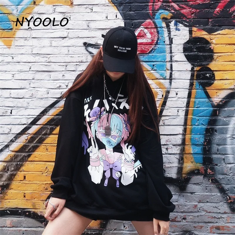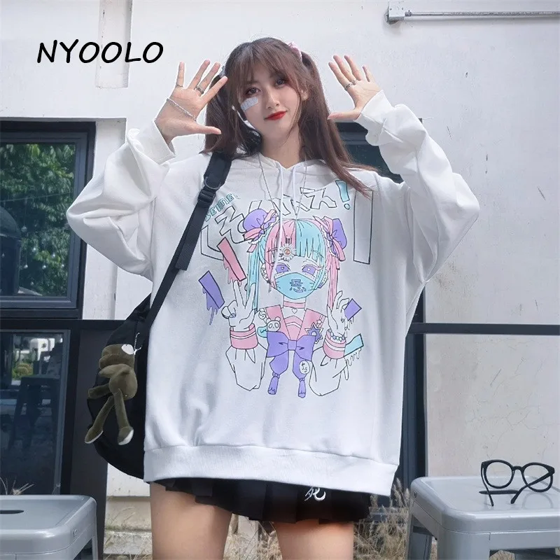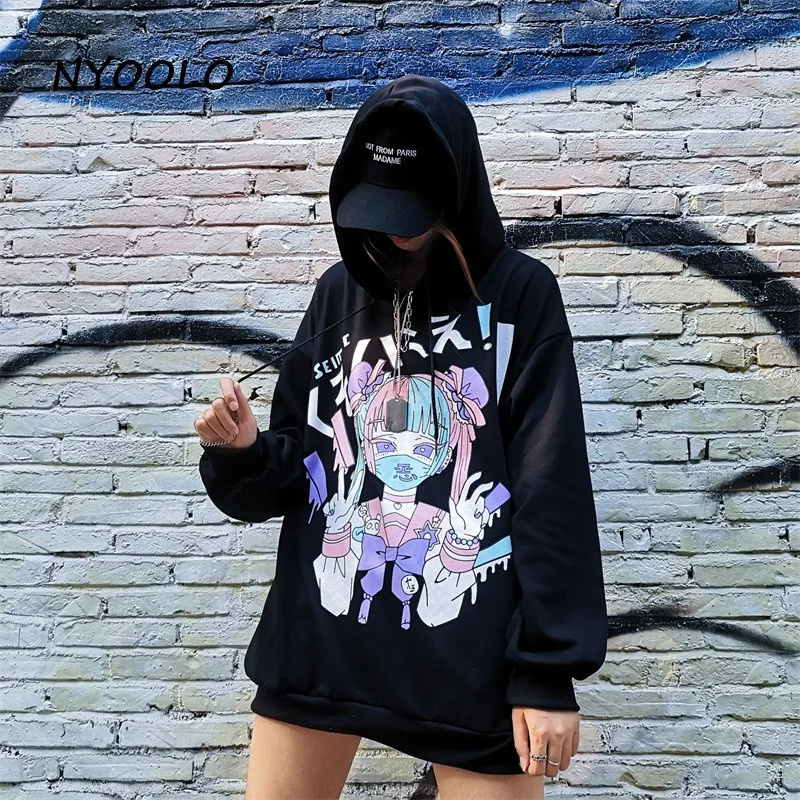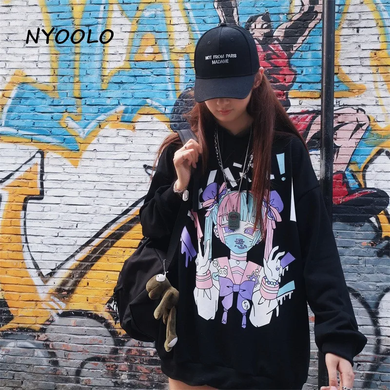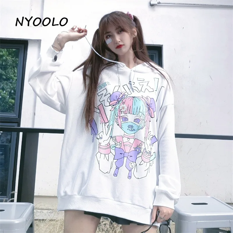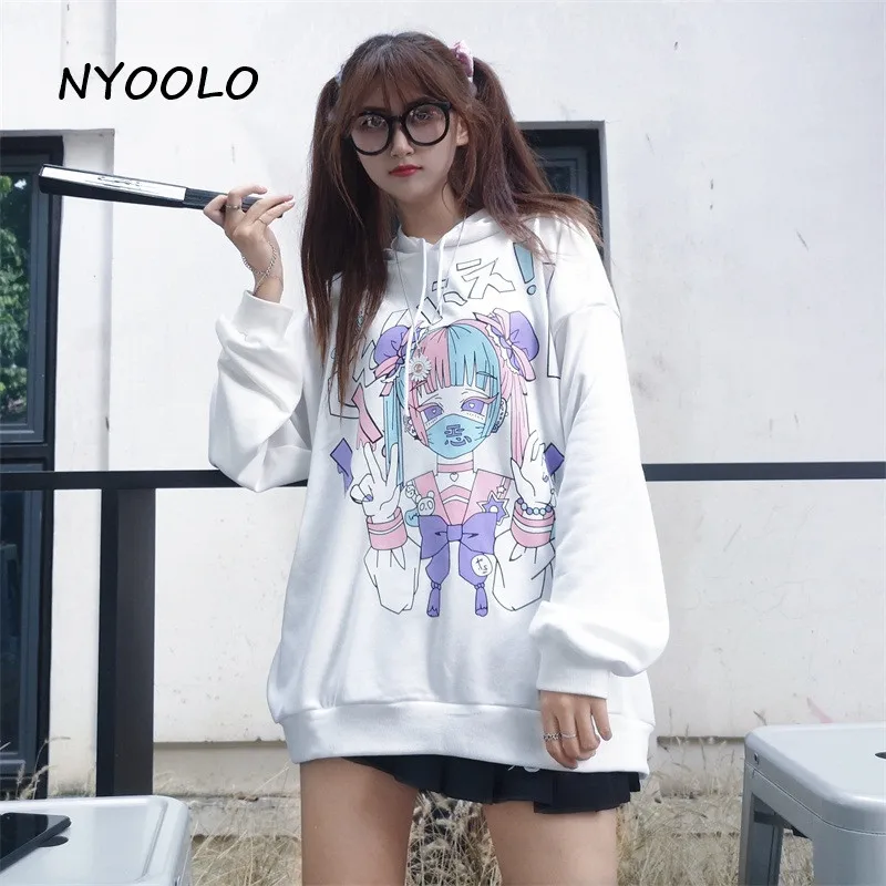 Женская толстовка с капюшоном NYOOLO, в стиле японских комиксов, с длинным рукавом, в стиле Харадзюку, осенняя, уличная, свободная, махровая