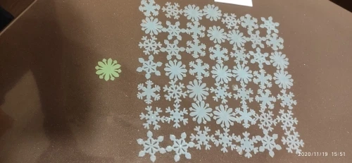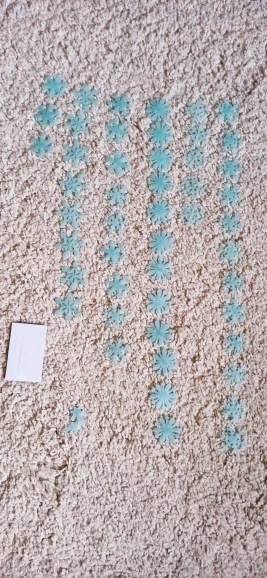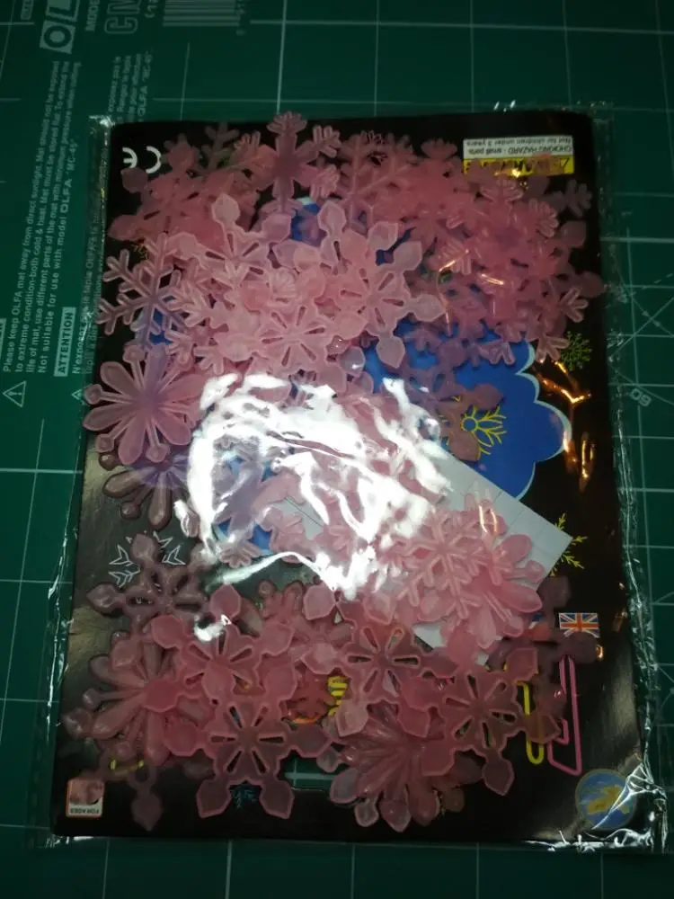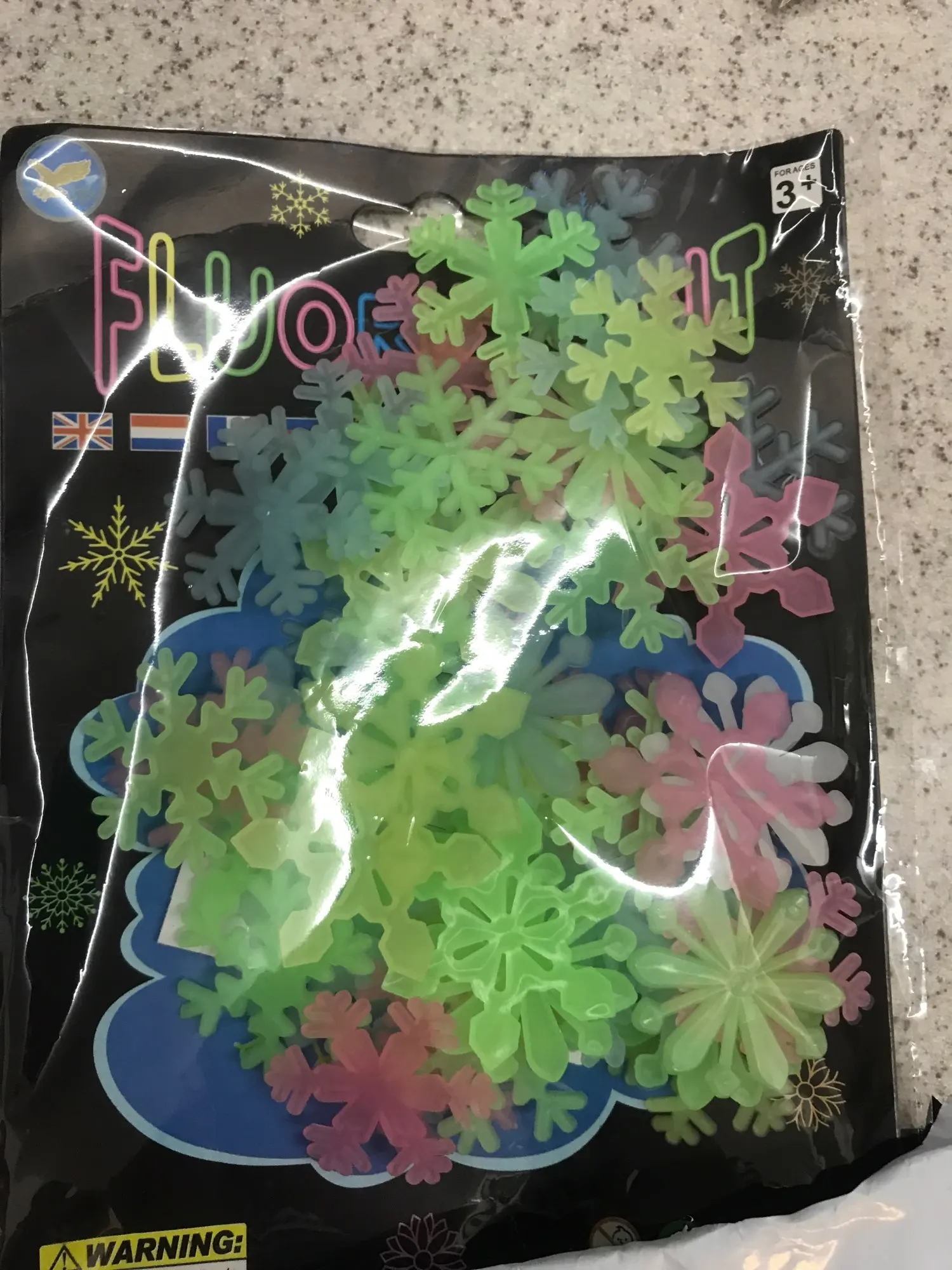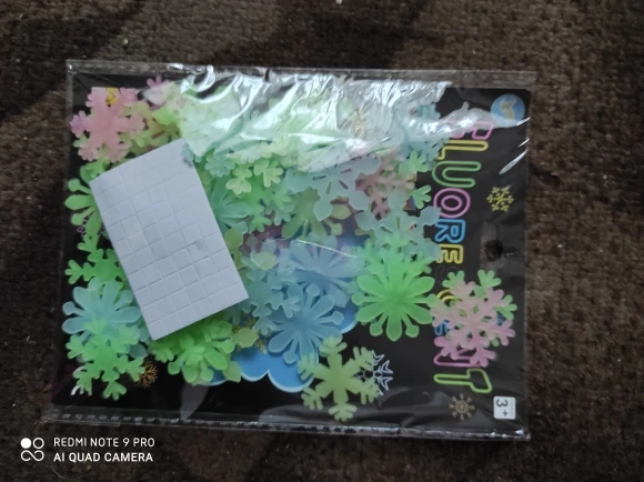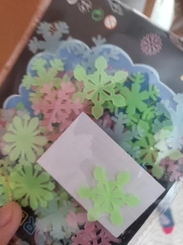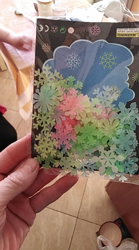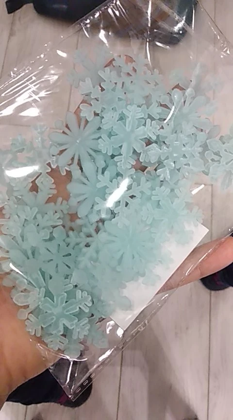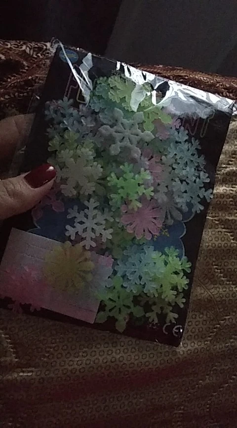 товар дошёл быстро, за 2 недели. заказала 2 набора, они в одной упаковке. снежинки из пластика, жёсткие. вроде светятся в темноте, но пока день, сильно не проверишь. вложена пластинка двухстороннего скотча, поделенная на квадратики. в мультиколорном наборе попались: 17 голубых, 14 зелёных, 9 жёлтых, 9 розовых и, к сожалению, всего 1 белая снежинки. Продавцу спасибо!!!