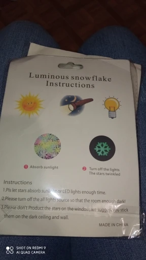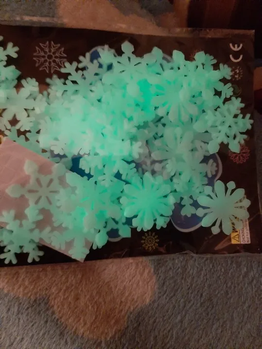 Снежинки хорошие 4 вида.Прислали 51шт.Пластмасса не пахнет.Брала белый цвет светятся зеленоватым в темноте.Правда недолго минут 10-15(за это убрала одну звезду),потом гаснут.В комплекте идет скотч для наклеивания.Доставили быстро.Получала на почте.
