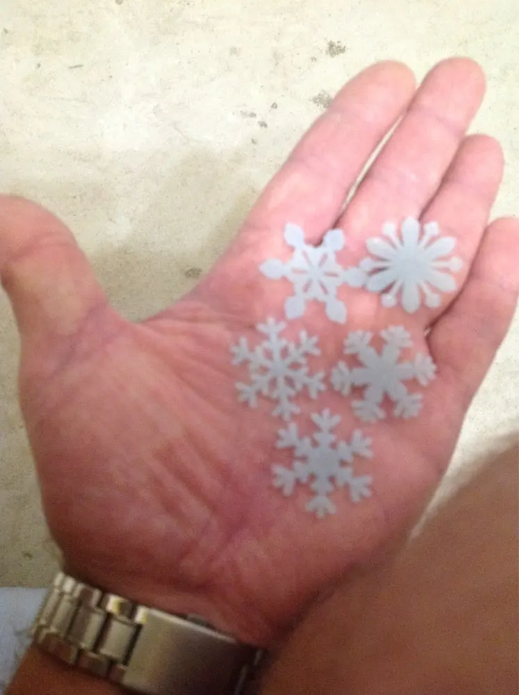 снежинки шли 2,5 месяца, к новому году не успели. 46 штук. одна неправильной формы, одна не того цвета, одних видов больше чем других. но в общем-то симпатичные. квадратики скотча двустороннего в комплекте.