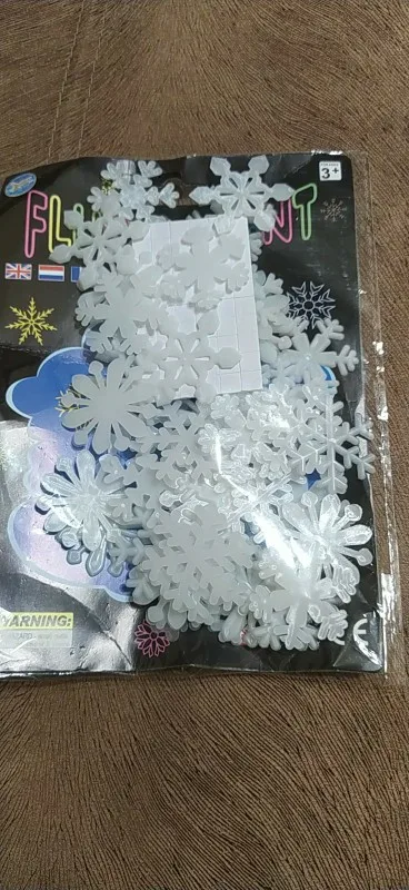 Товар соответствует описанию.Я думал,что это наклейки,а это пластиковые снежинки, которые надо приклеивать на двухсторонний скотч.Так товар нормальный.