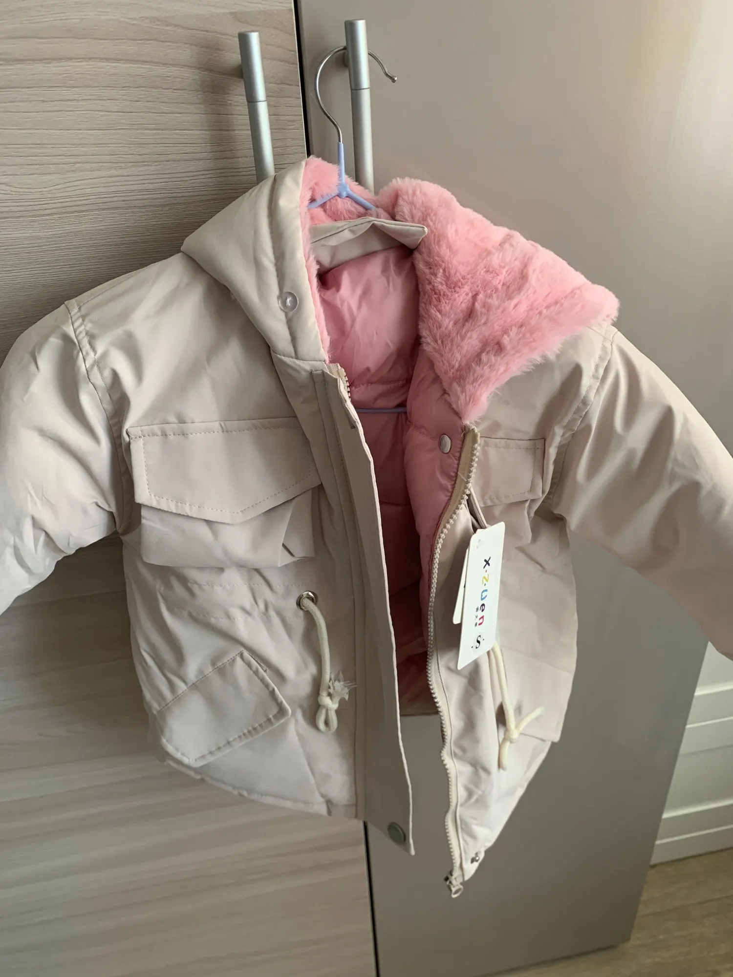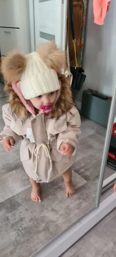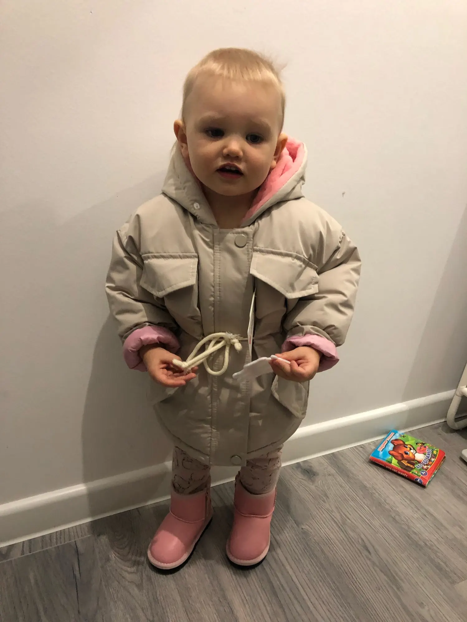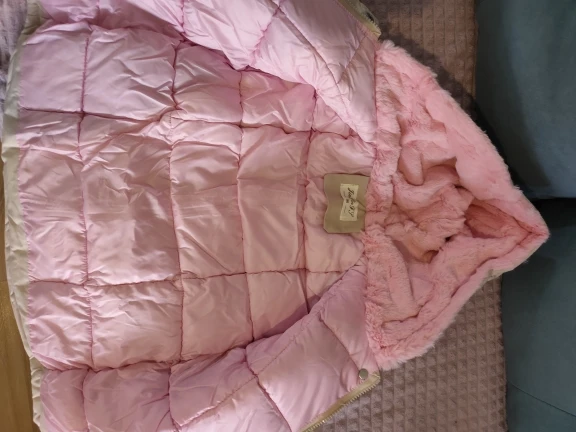 отличная курточка года на 1.5-2. внутри капюшона мягкий розовый мех и стеганая подкладка из шелка