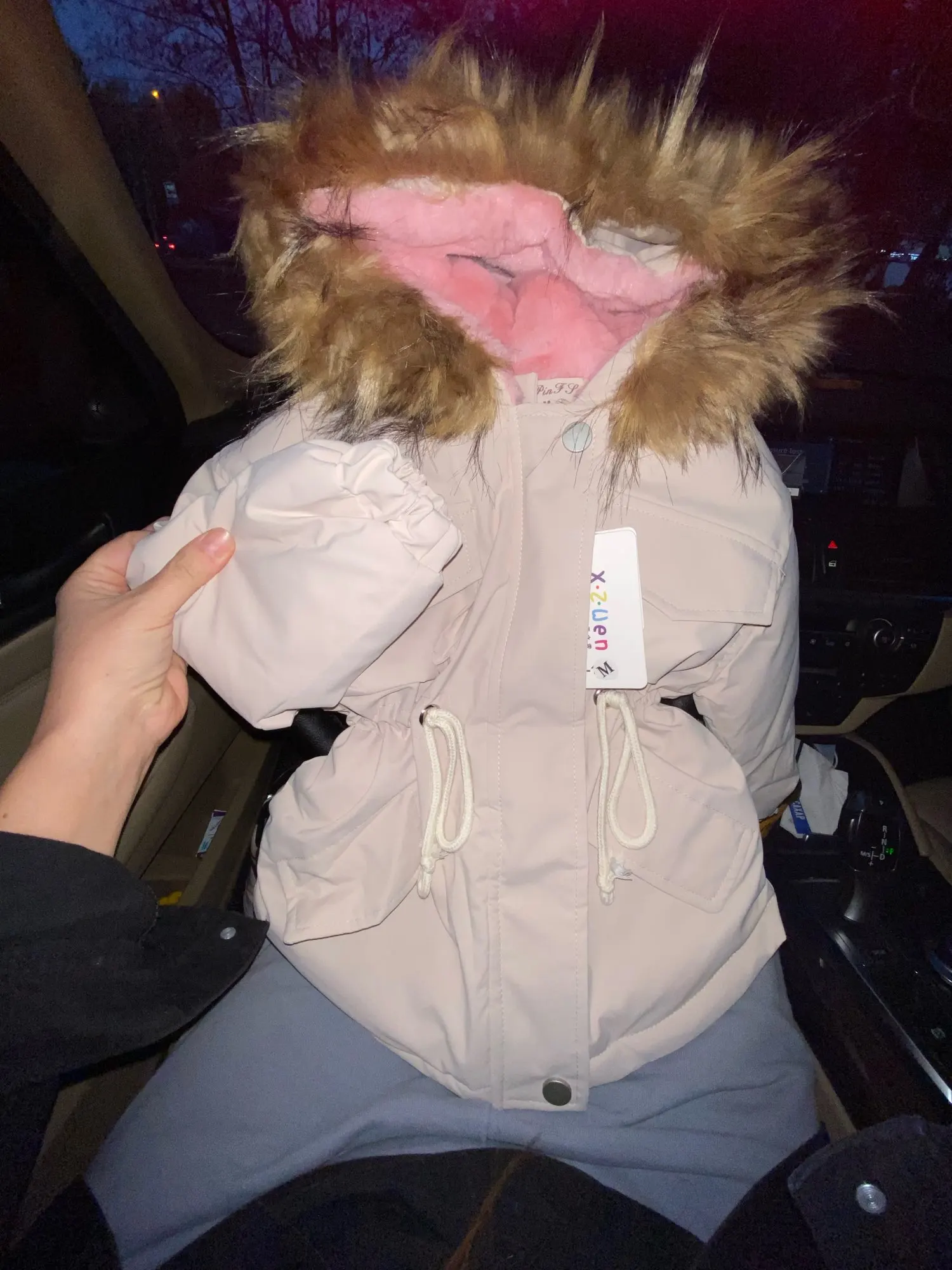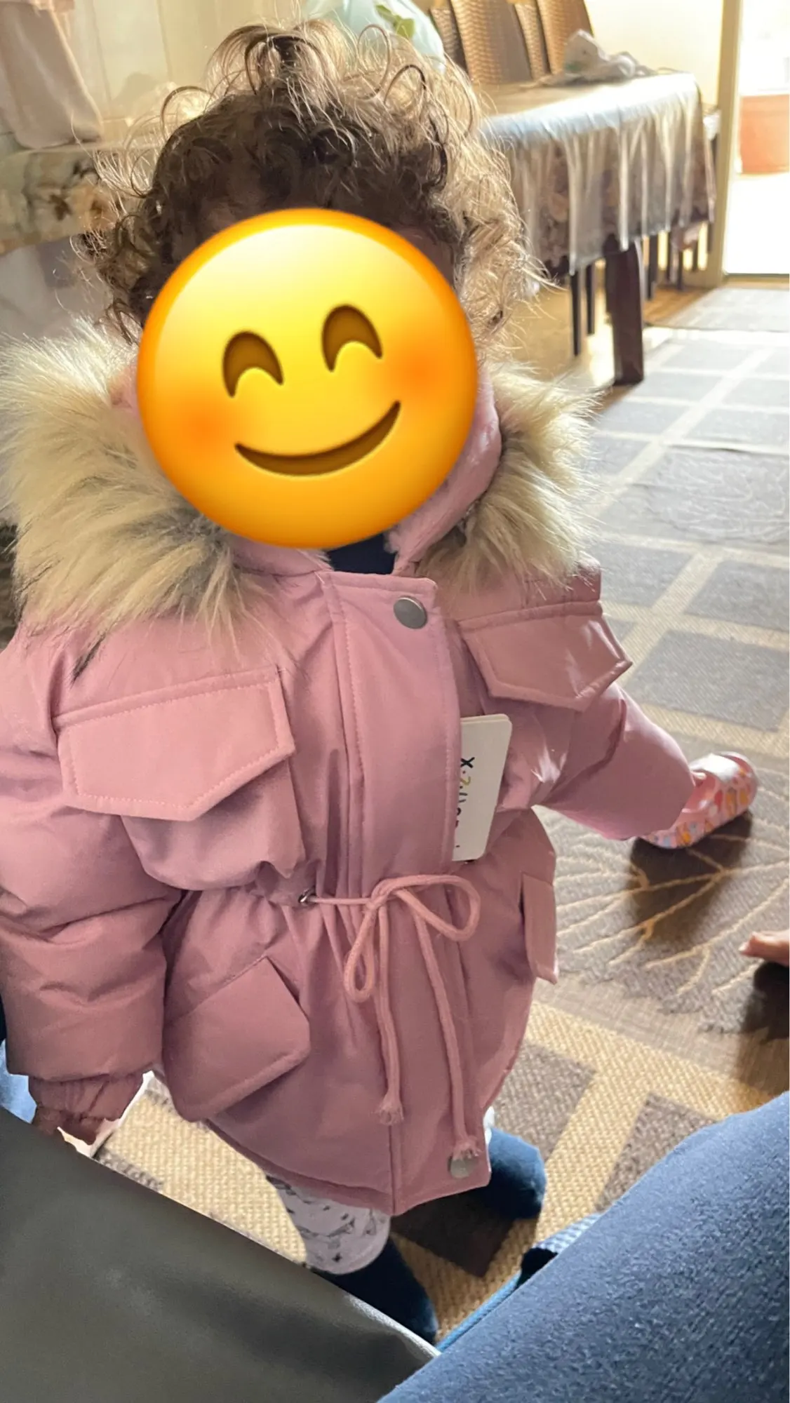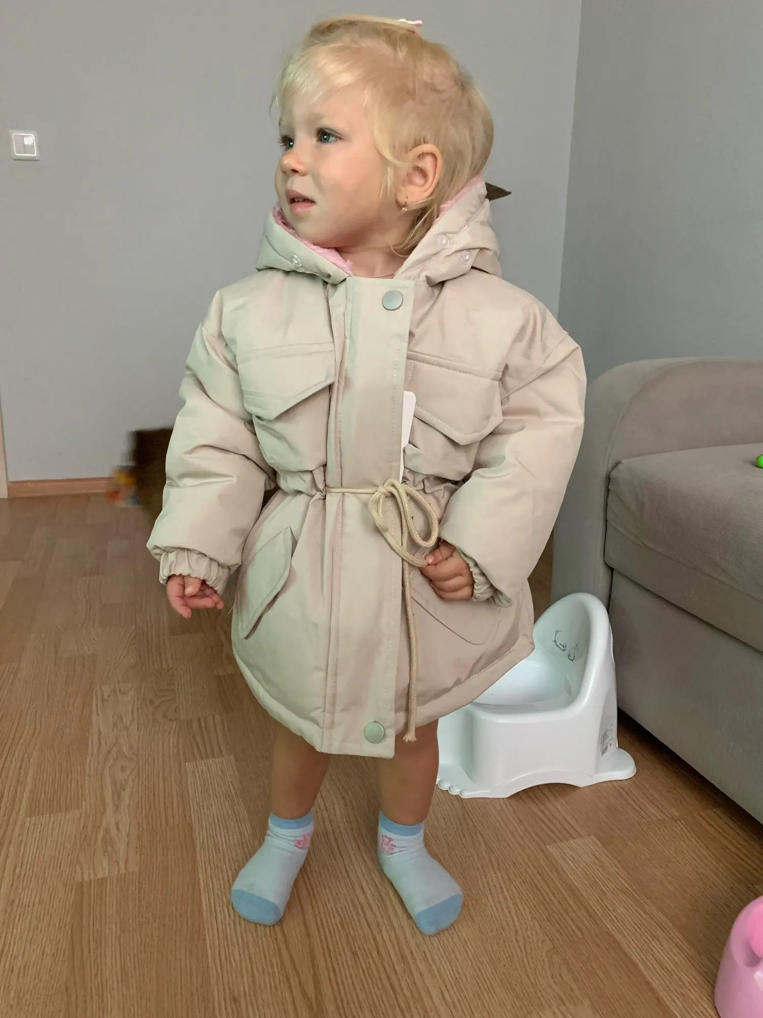 отличная курточка года на 1.5-2. внутри капюшона мягкий розовый мех и стеганая подкладка из шелка