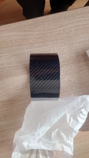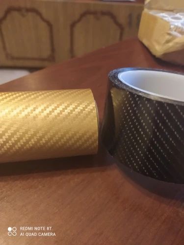 товар пришёл через 2 недели до Костромы, выглядит хорошо глянцевый блеск будто пленка под лаком, рядом положил простой карбон он матовый и нет блеска. лента с обратной стороны на темном скотче. я доволен спасибо, будет тепло наклею на пороги шкоды Октавии.