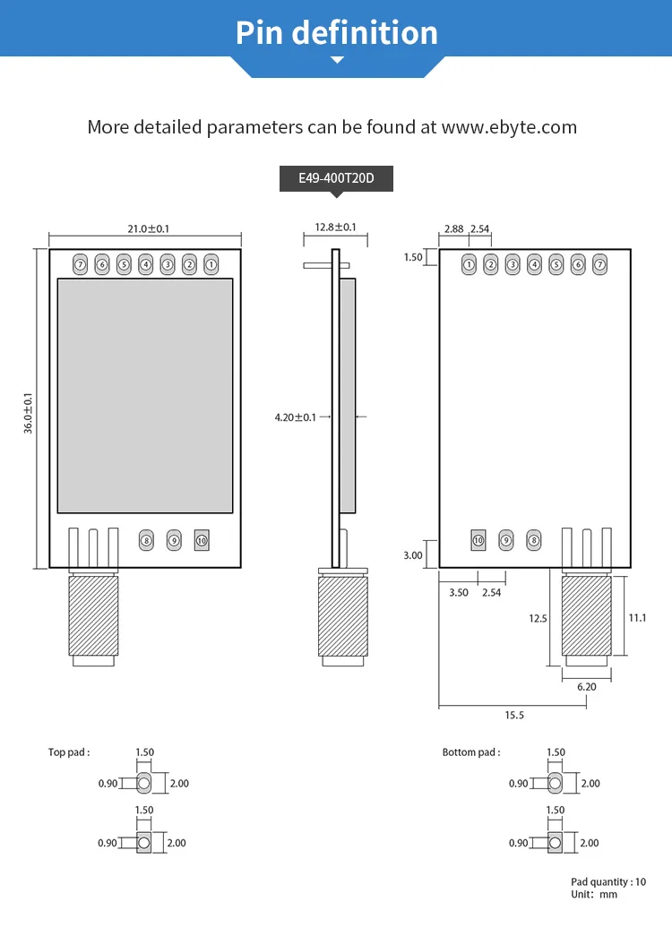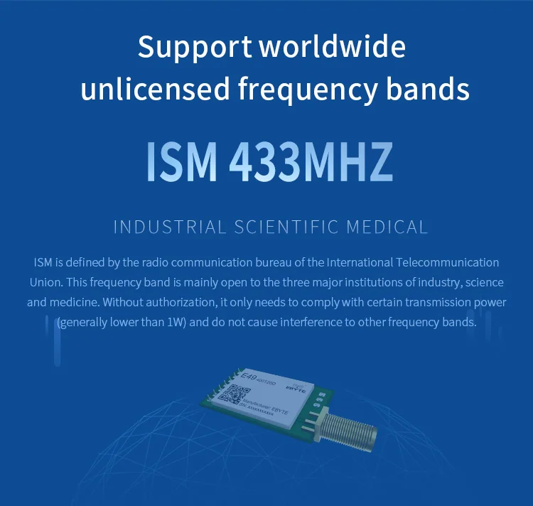 [Введение]:E49-400T20D является ультра-высоким экономически эффективным беспроводным модулем, разработанным Chengdu Ebyte. Есть 4 режима работы. Каждый режим передачи имеет свои особенности и может быть применен к различным сценариям применения. E49-400T20D идеально подходит для промышленного применения.