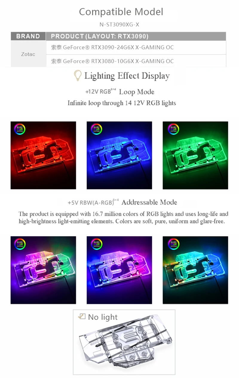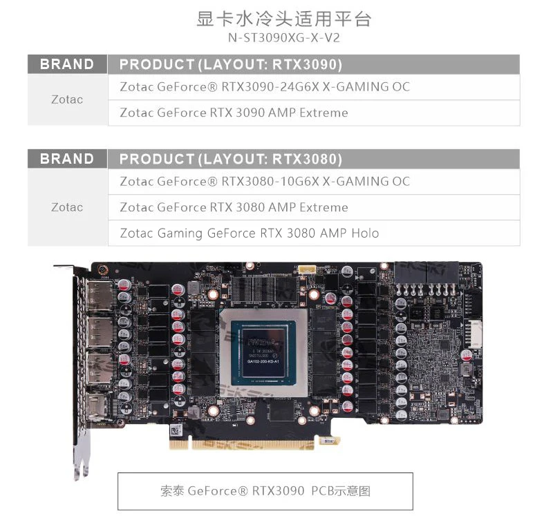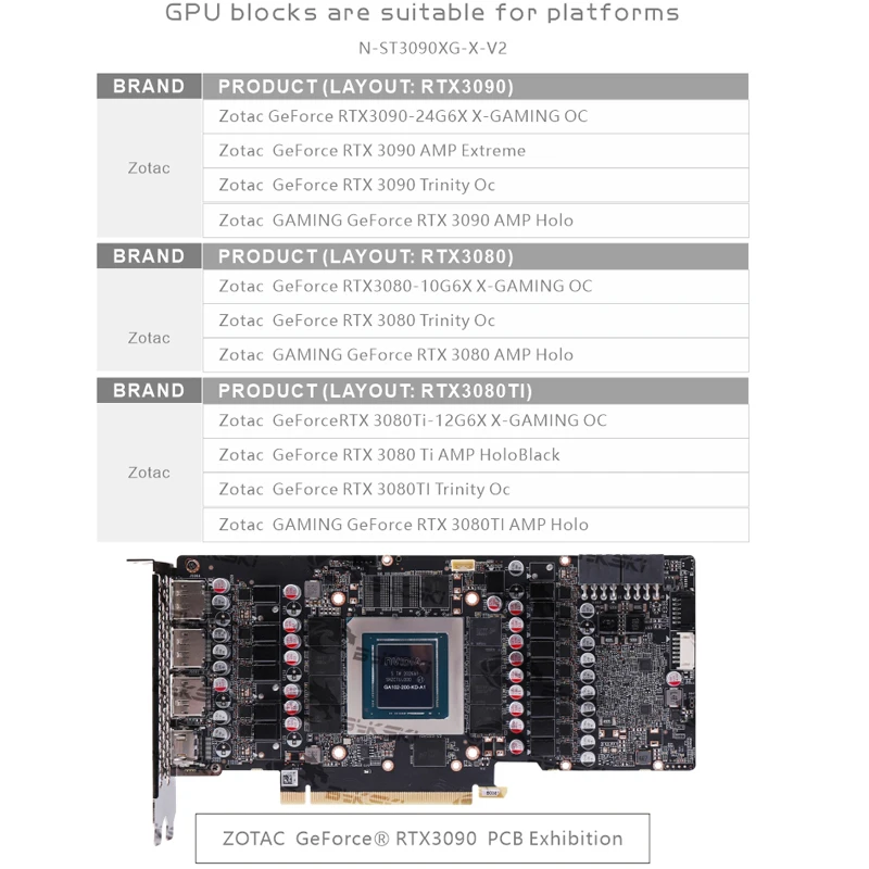 Петля: неалюминиевая(Включая, но не ограничиваясь следующими моделями)Zotac GeForce RTX3090-24G6X X-GAMING-OCZotac GeForce RTX3080-10G6X X-GAMING-OCZotac RTX 3080 ТроицыZotac RTX 3090 ТроицыZotac RTX 3080 X-GAMING OCZotac RTX 3090 X-GAMING OCZotac Gaming RTX 3080 AMP HoloСовместимость основана только на справочном дизайне, блок может не соответствовать измененным/супер-разгонным и другим вариантам третьей стороны, которые отличаются от эталонного дизайна.Фитинги: Резьба G 1/4Стоковые бэкплейты: из-за разницы в монтаже между картами, стоковые бэкплейты не гарантированно подходят.