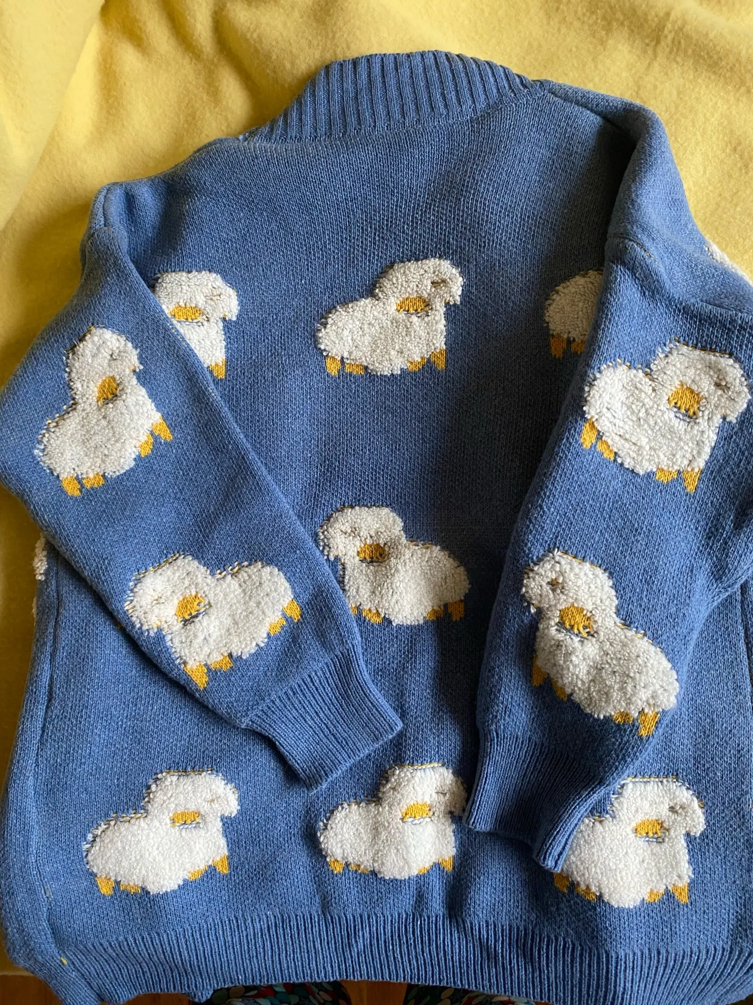 Какой красивый и качественный свитер ) очень тёплый , в составе есть шерсть ) свитер застегивается на пуговицы , зимой в нем тепло , рисунок в виде овечек очень оригинальный ) сразу купила его , по длине рукавов в самый раз , на рост 175 см , объём груди 90 см , талия 67 см , отлично сидит , свободно . При носке катышков не было , швы ровные , нитки не торчат , качество супер , рекомендую обязательно к покупке .