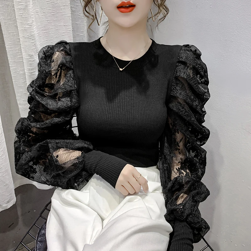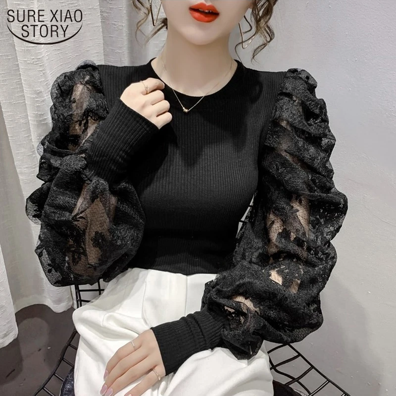 Женская кружевная вязаная рубашка, облегающая блузка с круглым вырезом и длинными рукавами-фонариками, модель 2021 в Корейском стиле на осень, 11263
