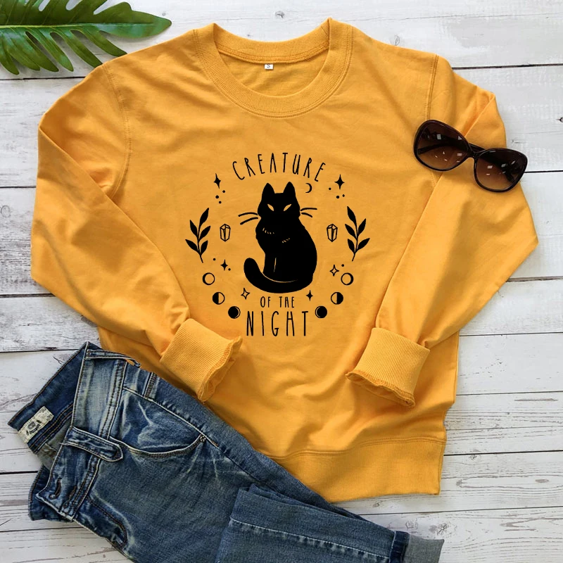 Толстовка с изображением ночного существа черного кота, модный Женский свитшот на Хэллоуин с ведьмой, пуловер со стразами в стиле зловещей Луны и небесного стиля