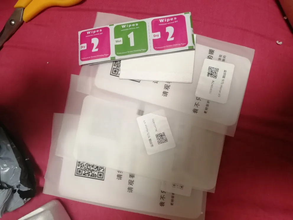 Три плёнки, три салфетки, три спириовве салфетки и грифель, посылка шла месяц, с учётом Китайского нового года, приобретением доволен, ещё не клеил