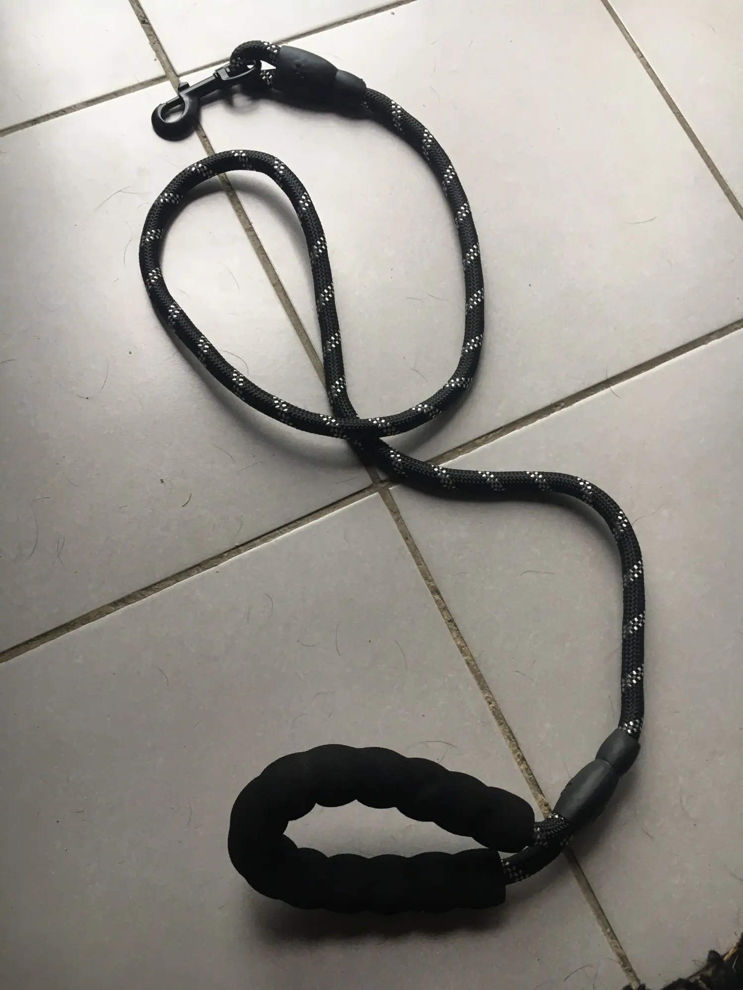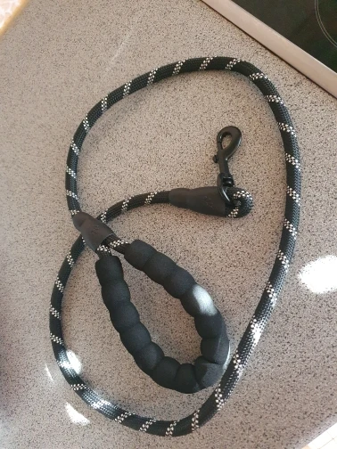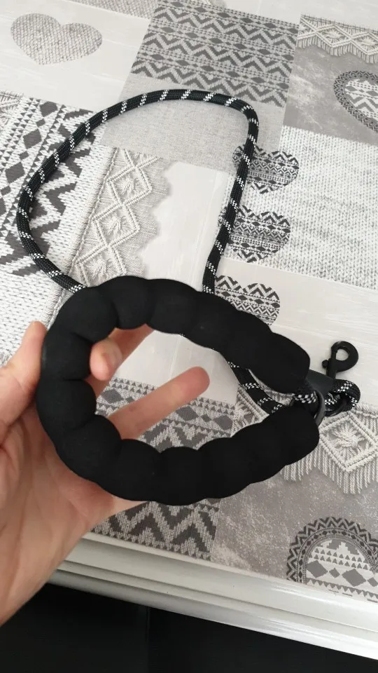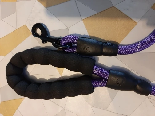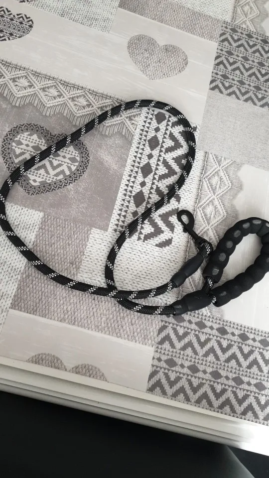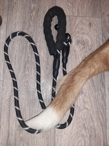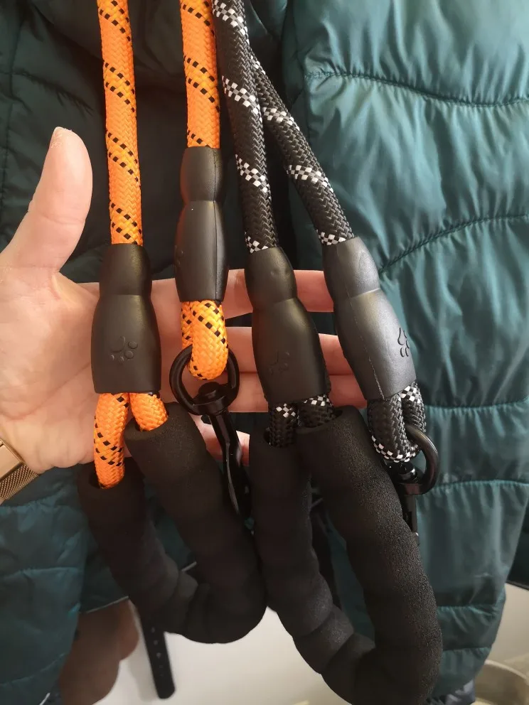 Идеальная длина! (Мы не можем отрегулировать длину) Исключительная ручка! Даже если это холодно, это круто, если собака тянет, это не больно, много комфорта! Будьте осторожны, однако, резиновые вещи на концах не очень хорошо держатся (теплая точка клея, и мы говорим больше) это отражает в темноте, когда есть автомобили, так что хорошо для безопасности