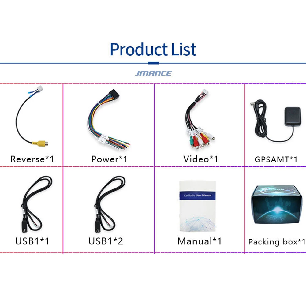 1 x мультимедийный проигрыватель для автомагнитолы Android1 Антенна GPS2 x USB-кабеля1 кабель RCA1 x Кабель Питания1 X входной кабель камеры заднего вида1 X Руководство пользователя