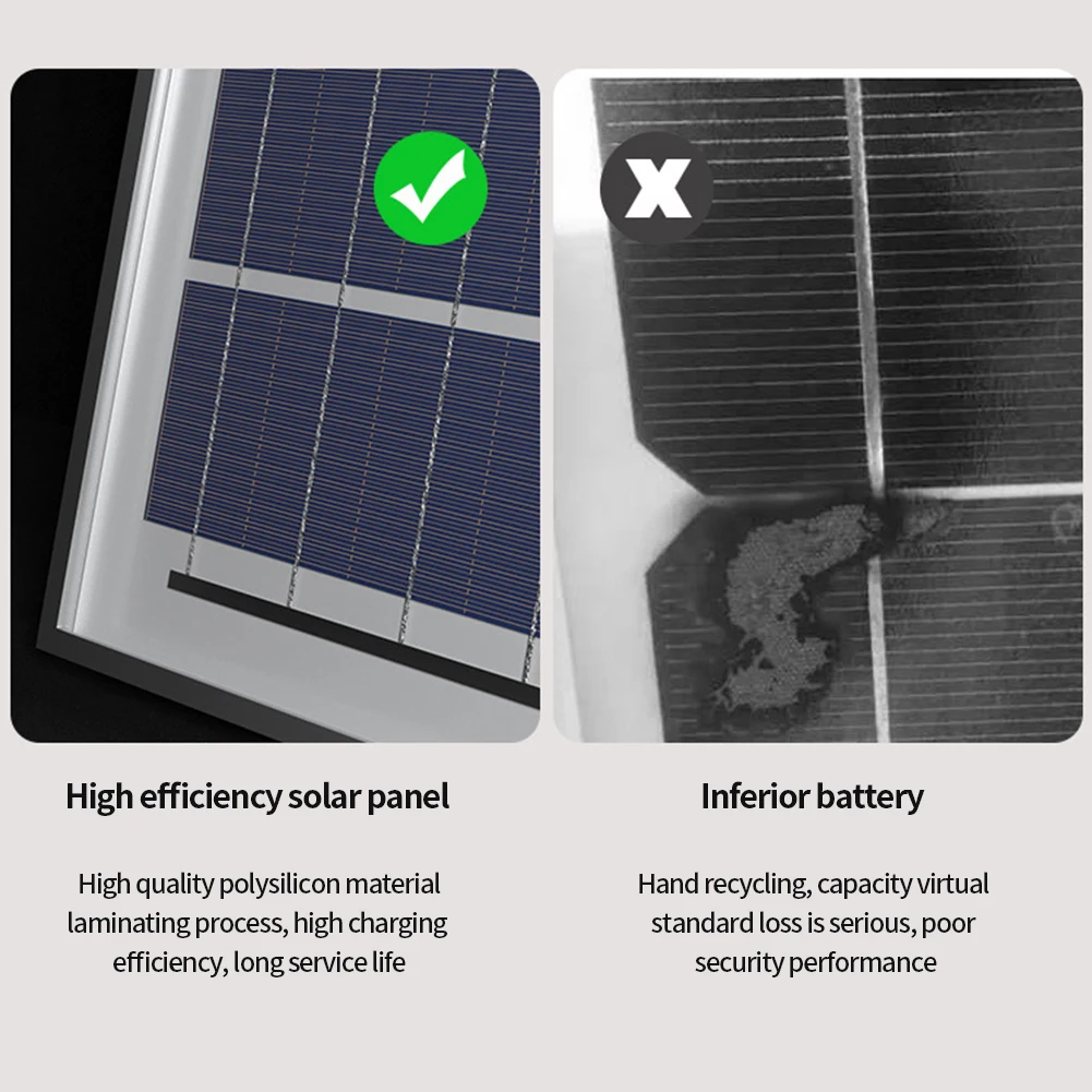 Нулевой заряд электроэнергии в течение всего года, энергосбережение и защита окружающей среды; Обновление пяти линий сетки, слабый светильник также может генерировать электричество; Яркий светодиодный; Интеллектуальный светильник; Высокий уровень разряда воды, безопасный и прочный; оригинальная мощная литиевая батарея, длительный срок службы.