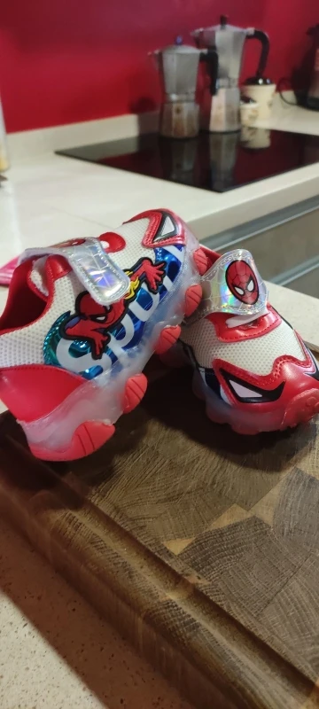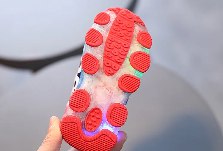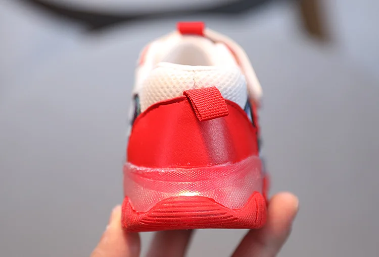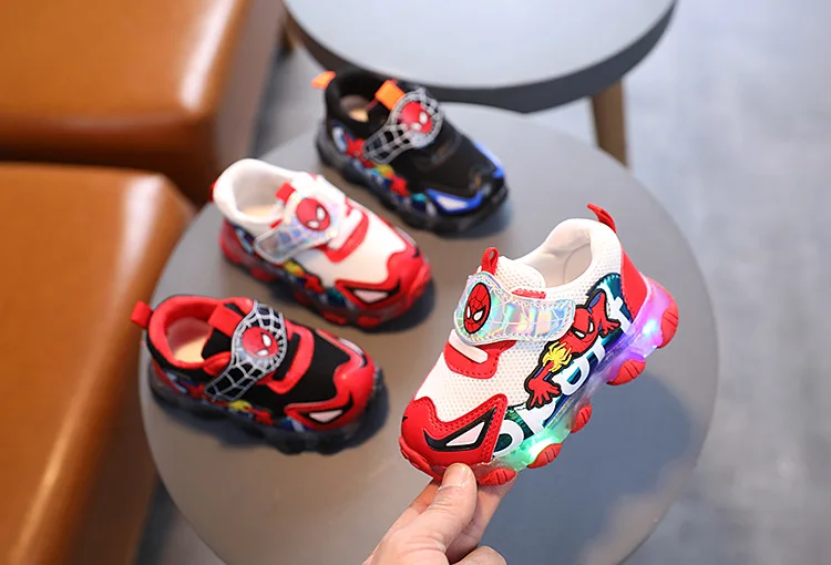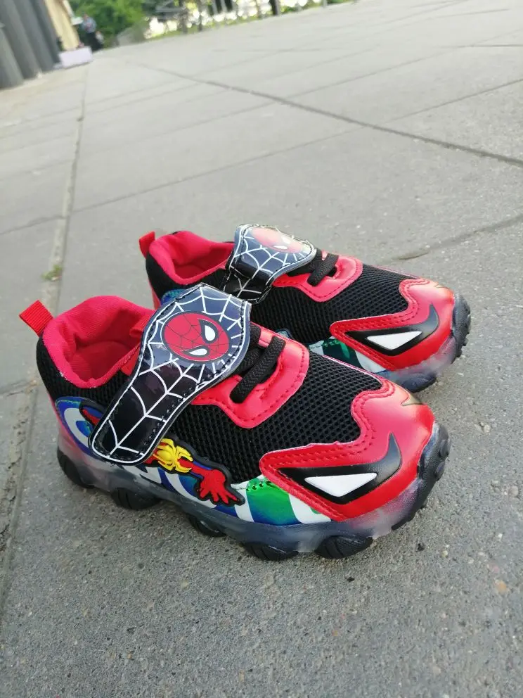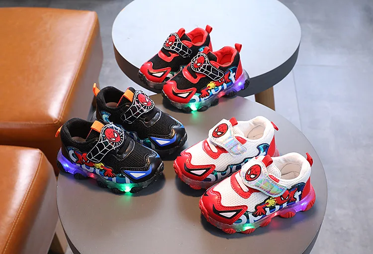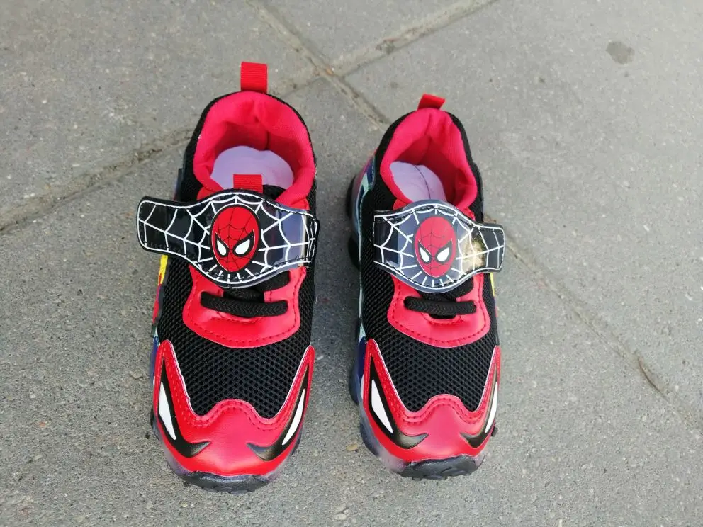 Детские кроссовки для мальчиков со светодиодами Человек-паук, детская спортивная легкая обувь с героями мультфильмов, повседневные ботинки из искусственной кожи, спортивная обувь с резиновыми кнопками