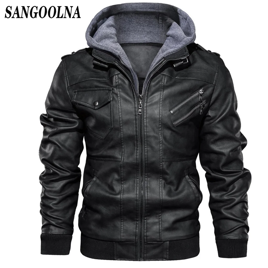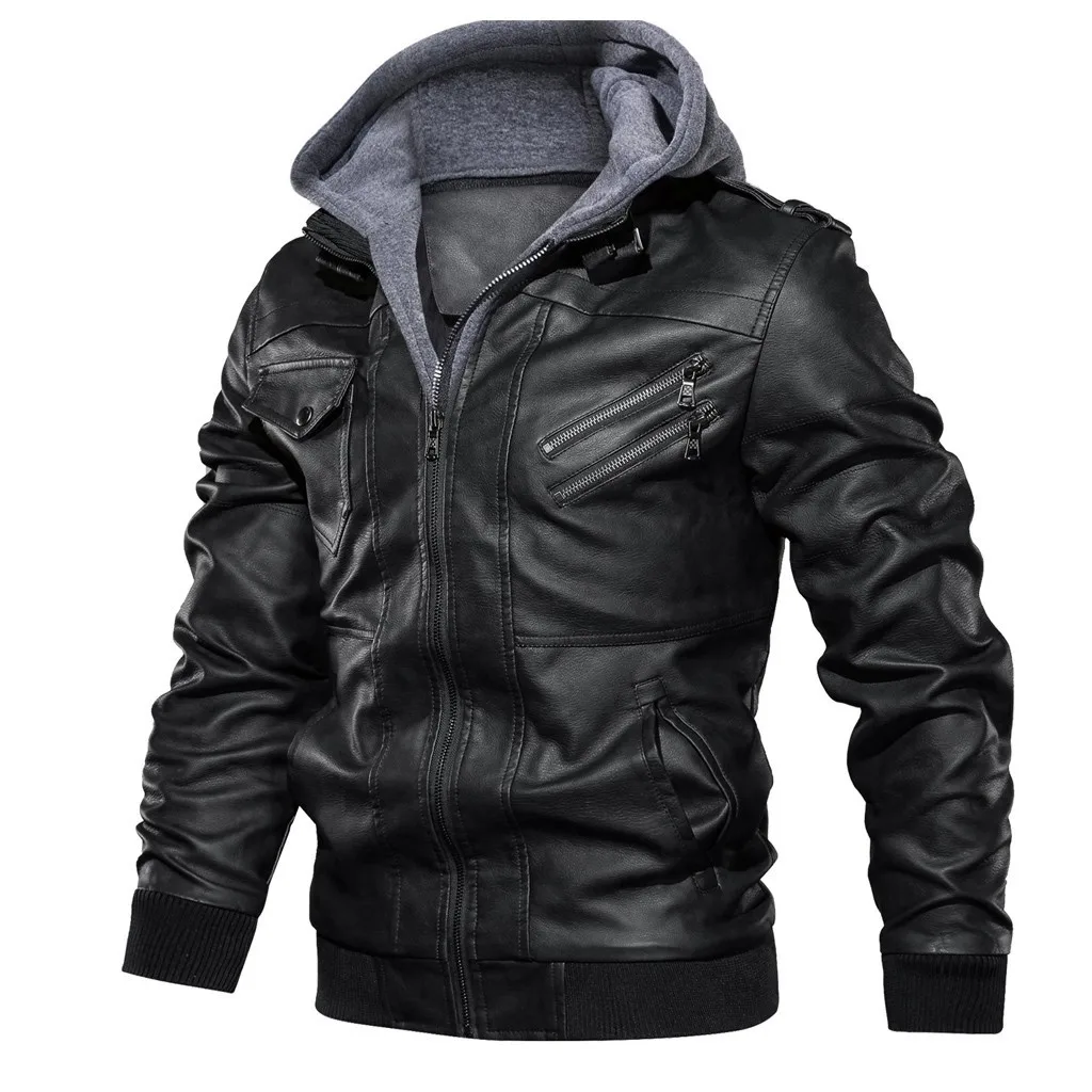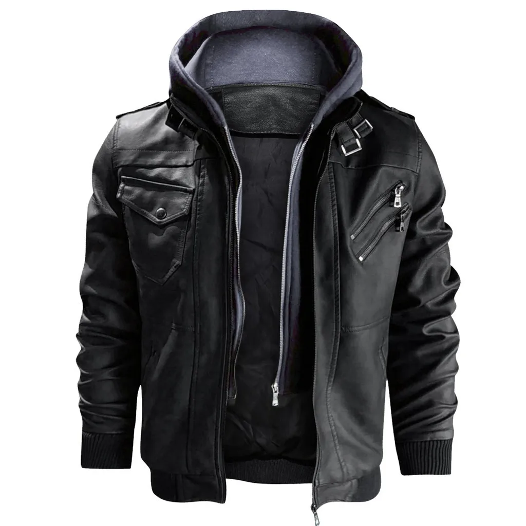 Мужская осенне-зимняя Толстовка со съемным капюшоном чистого цвета из искусственной кожи