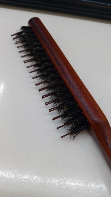 Щетка пришла с волосами, может мне не повезло просто. К сожалению щетина на центральном ряду выше чем у боковых. Скользит по волосам. На фото щетка с вором одной длины. Выглядит красиво, модно украсить рабочее место парикмахера. Не знаю куда щётку использовать, может для чистки одежды.
