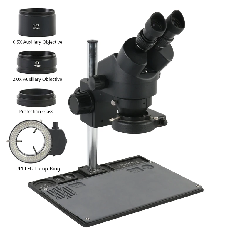 7X-45X непрерывный стереомикроскоп с зеркальной фотографией + светодиодная кольцесветильник 144 светодиодный Многофункциональная подставка из алюминиевого сплава
