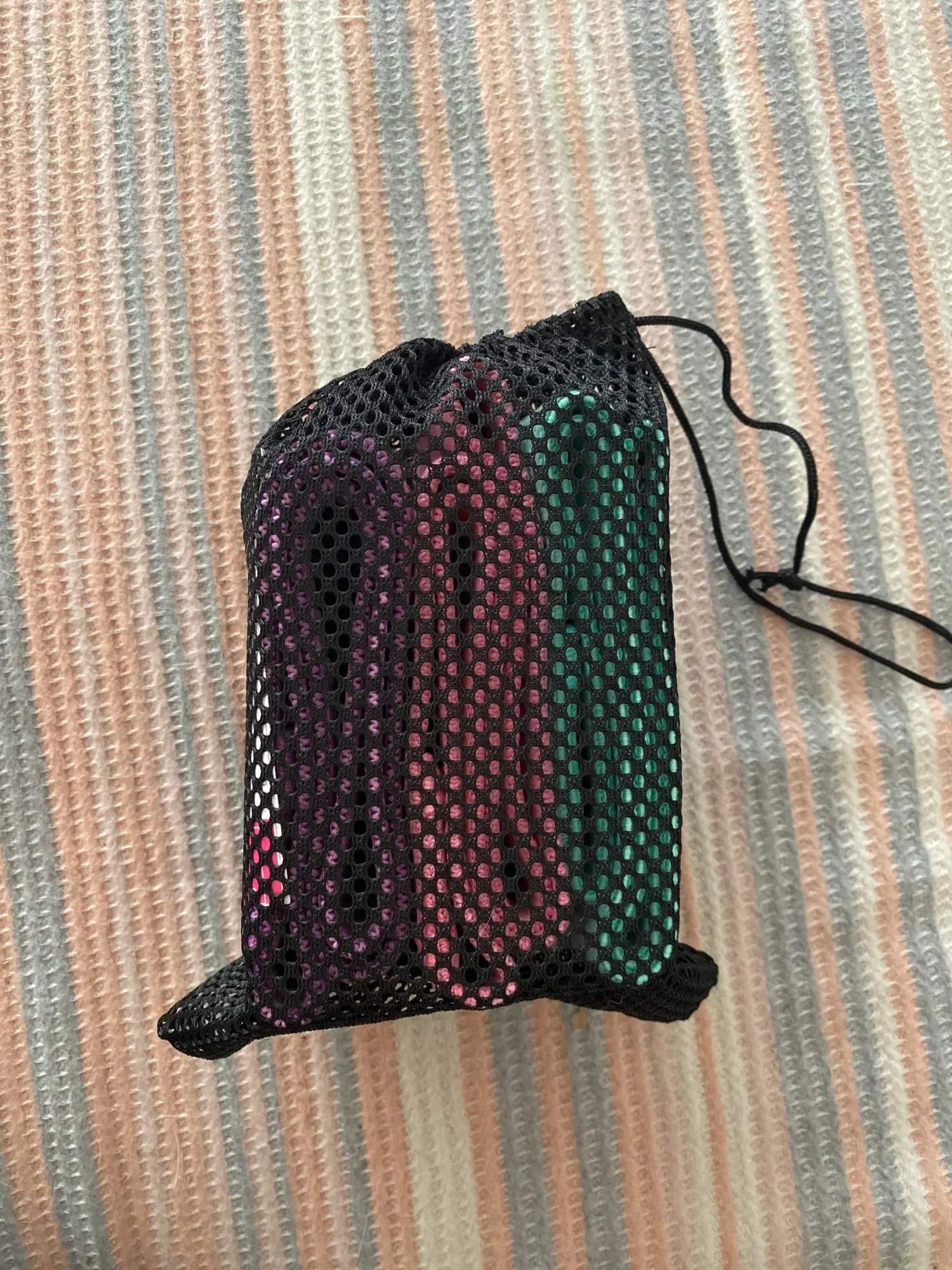 пришли все три резиночки, аккуратно упакованные. На фото резинки уже сложены в специальную сетчатую сумку, которая шла вместе с резинками