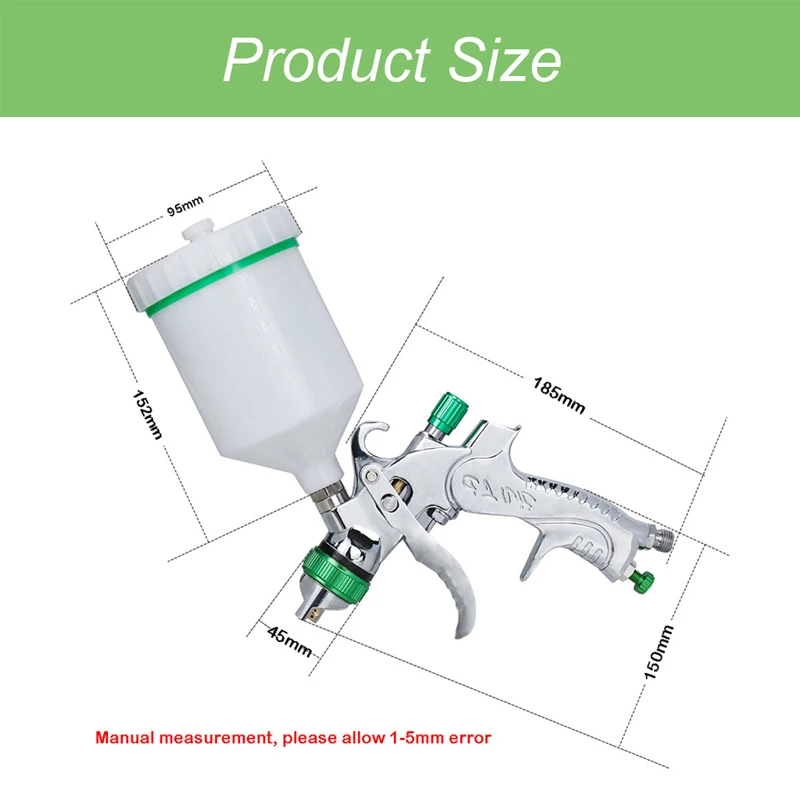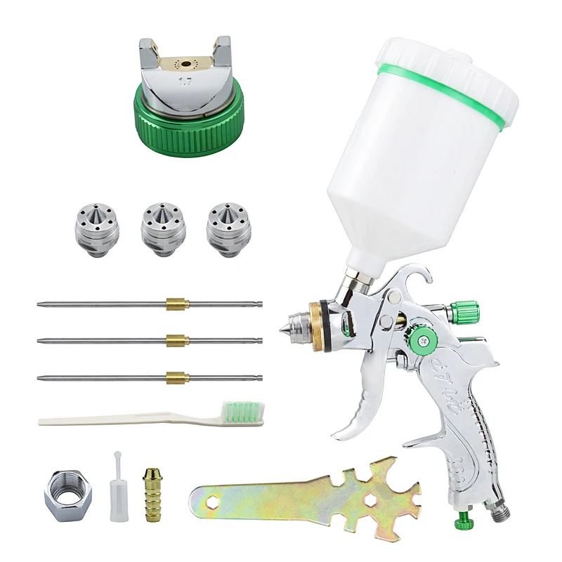 Характеристики: HVLP пистолет-распылительОсобенности 2: гравитационный пистолетФункция: КраскораспылительФункция 2: набор распылителя, аэрографТип: инструмент для ремонта, пистолет-распылительИнструменты: набор электроинструментов, пистолет-распылительРазмер насадки: 1,4/1,7/2,0 ммМатериал сопла: нержавеющая стальНоминальное давление: 45-60PSIПрименение: покраска забора, дверей, автомобилей и сгустков