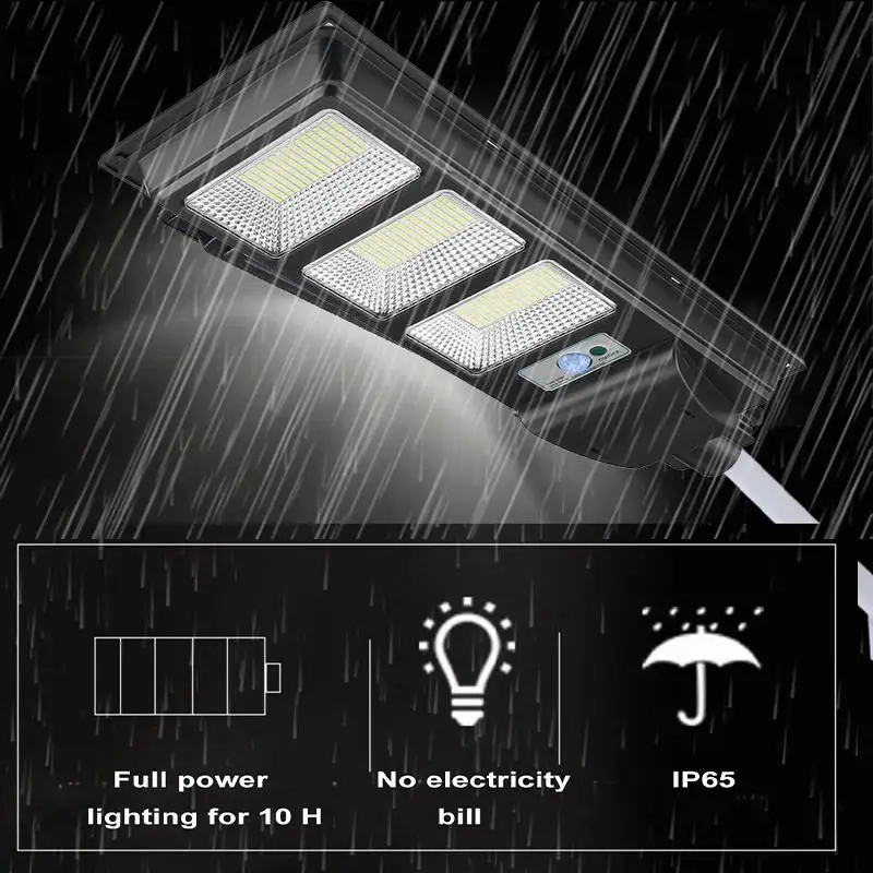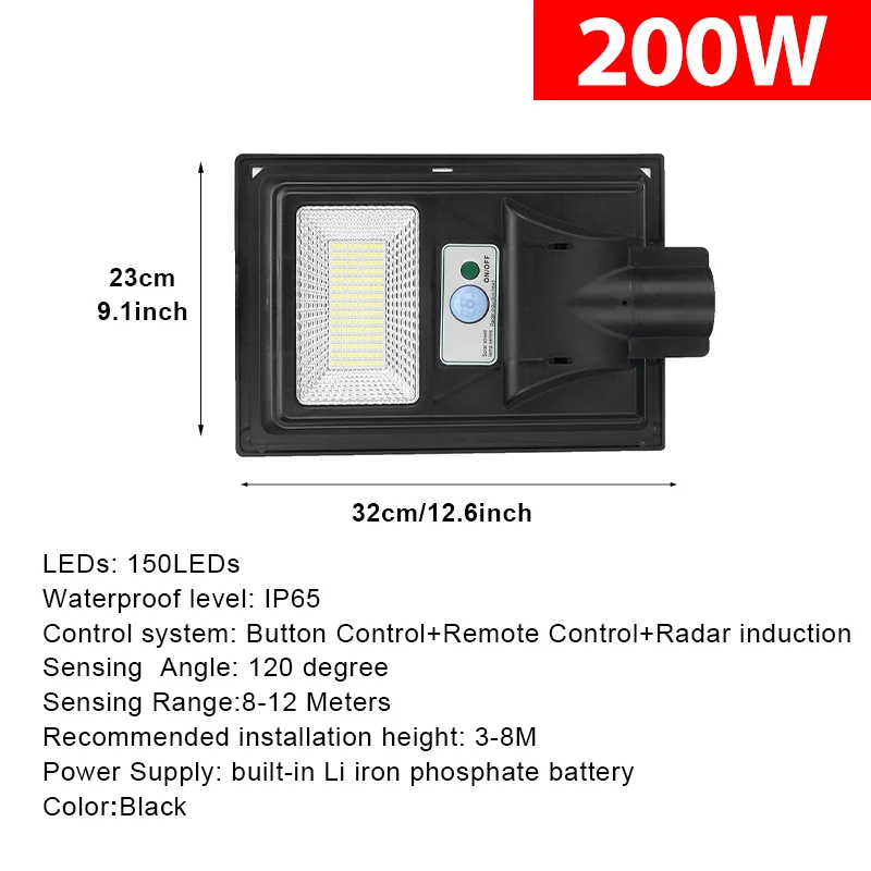 Особенности:-Светодиодный светильник высокой яркости 150/300/450/600, энергосберегающий, ровный светильник, долговечный.-Поликристаллическая солнечная панель преобразует солнечную энергию в электричество, более экологически чистый.-Технология распознавания человеческого тела делает его более энергоэффективным, светильник включается при обнаружении движения, тусклый светильник при отсутствии движения.-Солнечные панели преобразуют солнечную энергию в электричество, более экологически чистые.-Корпус из АБС-пластика, высокая твердость, герметичность и водонепроницаемость-Простая установка, без технического обслуживания надежная работа без необходимости подключения или траншеи. Водонепроницаемый алюминиевый сверхпрочный корпус.-Пожалуйста, включите переключатель перед установкой или зарядкой.-Применение: наружная стена или столб на площади, парке, саду, во дворе, улице, дорожке, пути, кампусе, ферме, периметре безопасности и т. Д.Характеристики:Материал корпуса: АБС-пластик + ПоликарбонатИсточник света: 150/300/450/600 светодиодный s светодиодный чип высокой яркости (ярче, более устойчив к температурам)Цветовая температура: 6500K (холодный белый)Мощность: 200/400/600/800 Вт (опционально)Уровень водонепроницаемости: 95% герметичный эффективный водонепроницаемый (дождь)Система управления: кнопочное управление + пульт дистанционного управления + индукция радараУгол срабатывания: 120 градусовДиапазон срабатывания: 8-12 метровРекомендуемая высота установки: 3-8 мСтепень водонепроницаемости: IP65Источник питания: Встроенный литий-фосфатный аккумуляторЦвет: черный