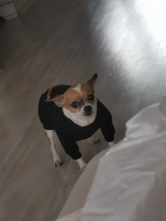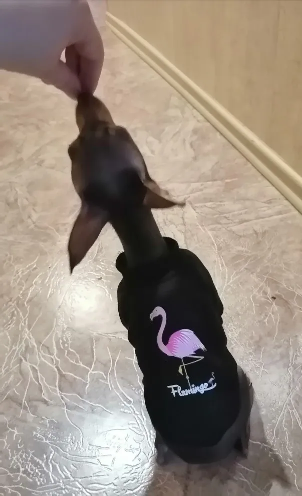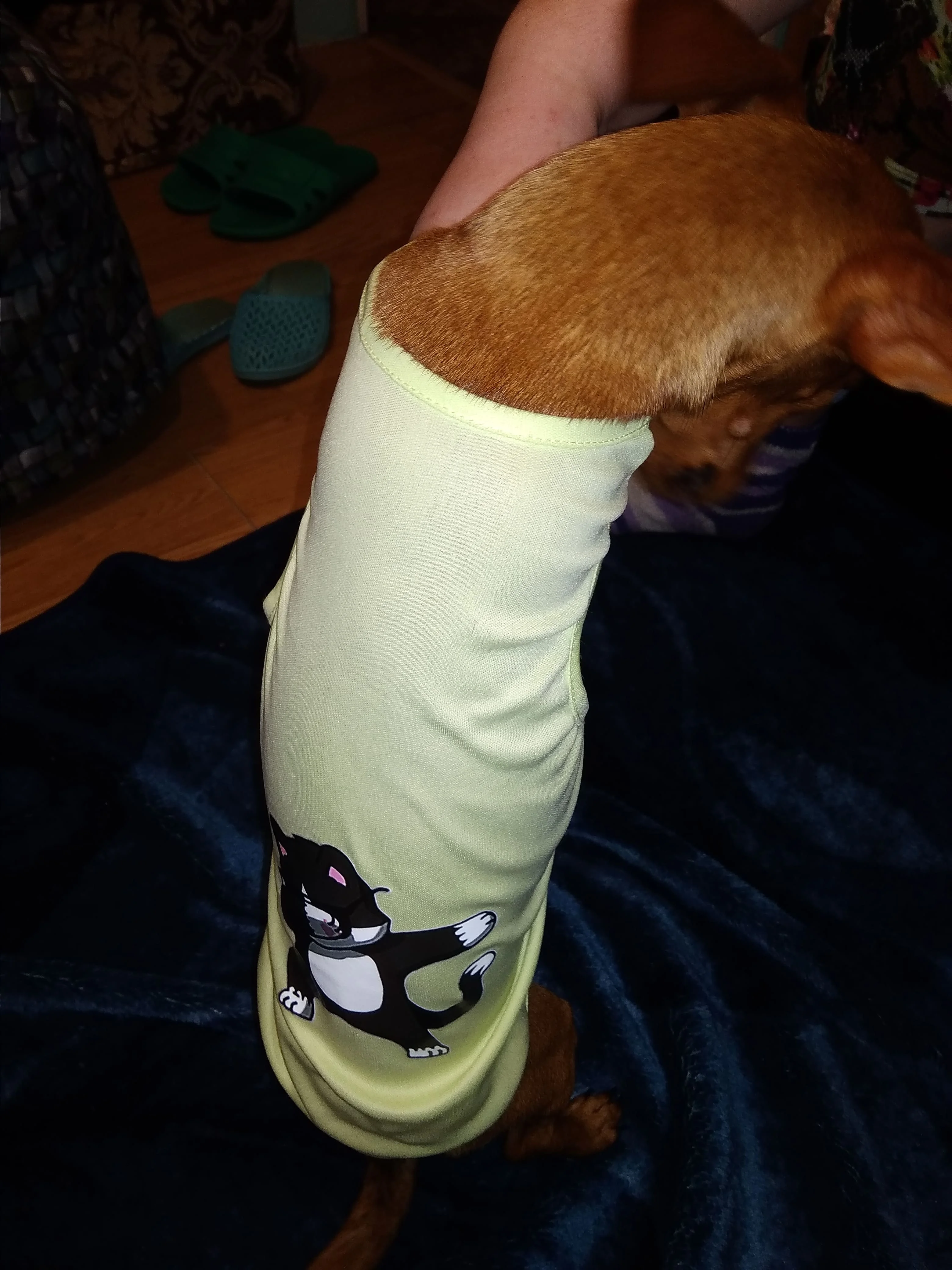 Заказала 31.12.20, получила 17. 02.Трикотажная футболка, без начеса. Сшита аккуратно, На маленькую чихуашку, самое то.