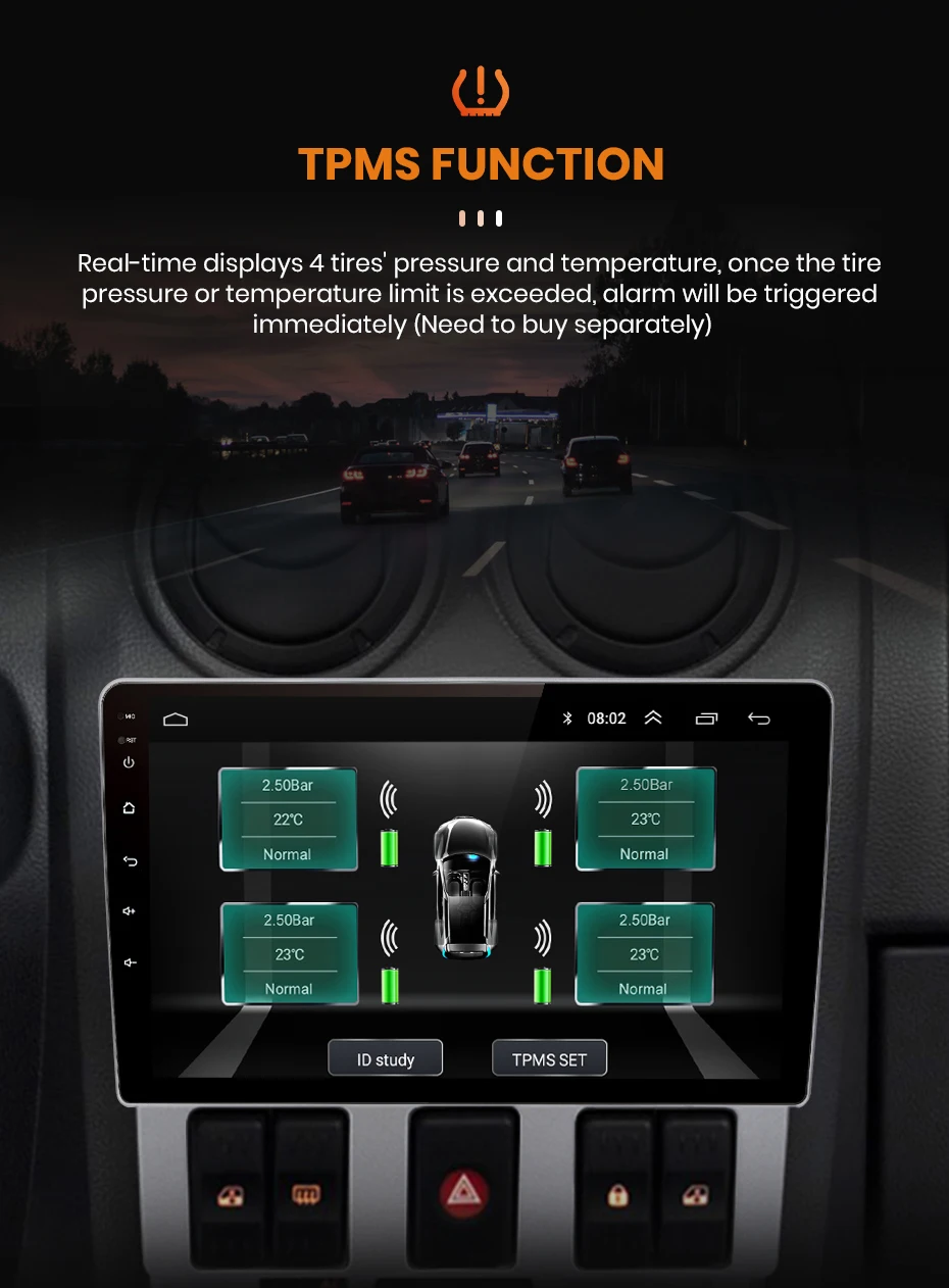 > Отображает 4 давления и температуры в режиме реального времени. Как только давление или температура в шинах будут необычными, сразу же будет сигнал тревоги.