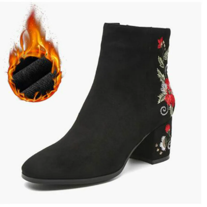 Ботильоны женские зимние теплые плюшевые, модные короткие сапоги с вышивкой, повседневная обувь на высоком каблуке, с круглым носком, на молнии