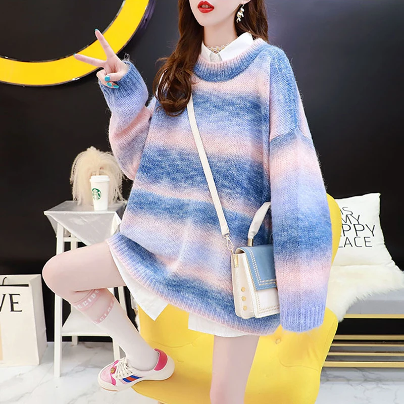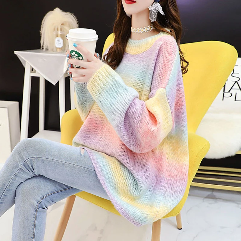 Милый женский свитер JMPRS, пуловер, Радужный женский японский вязаный джемпер, свободный осенний Розовый Топ с длинным рукавом, новинка 2021