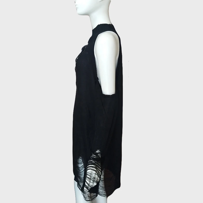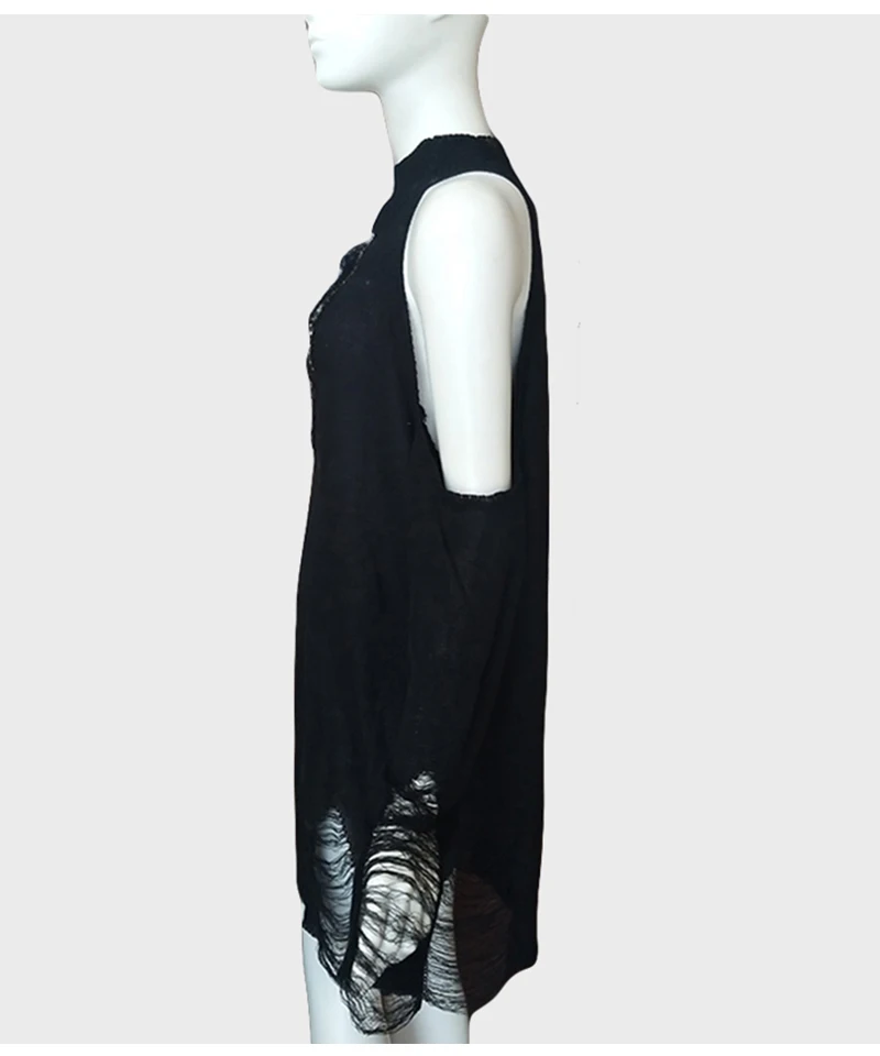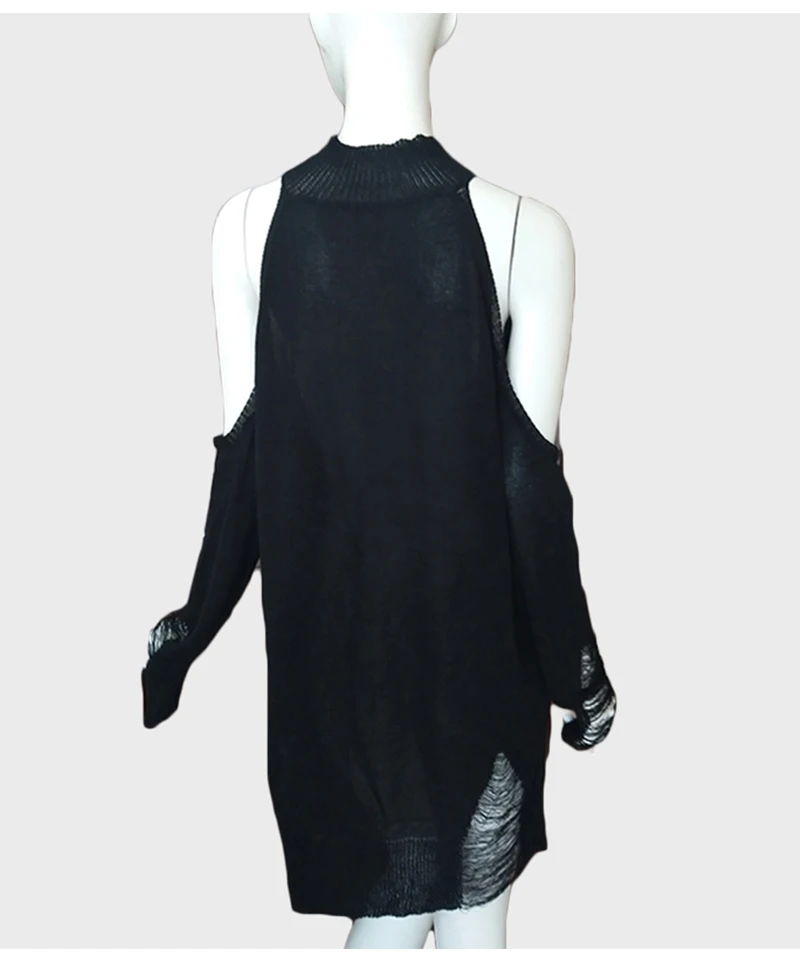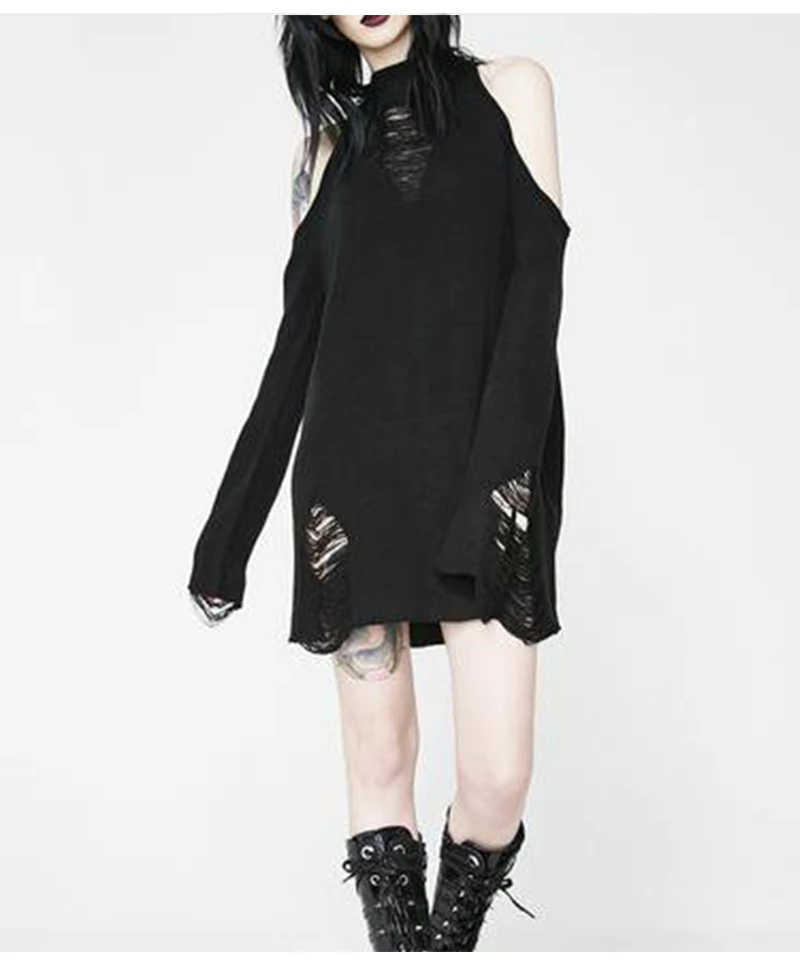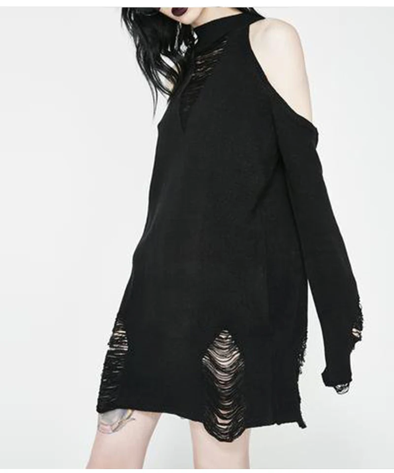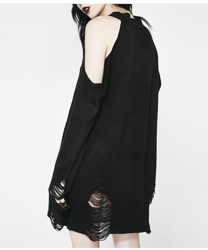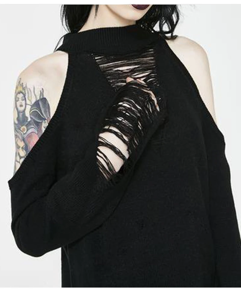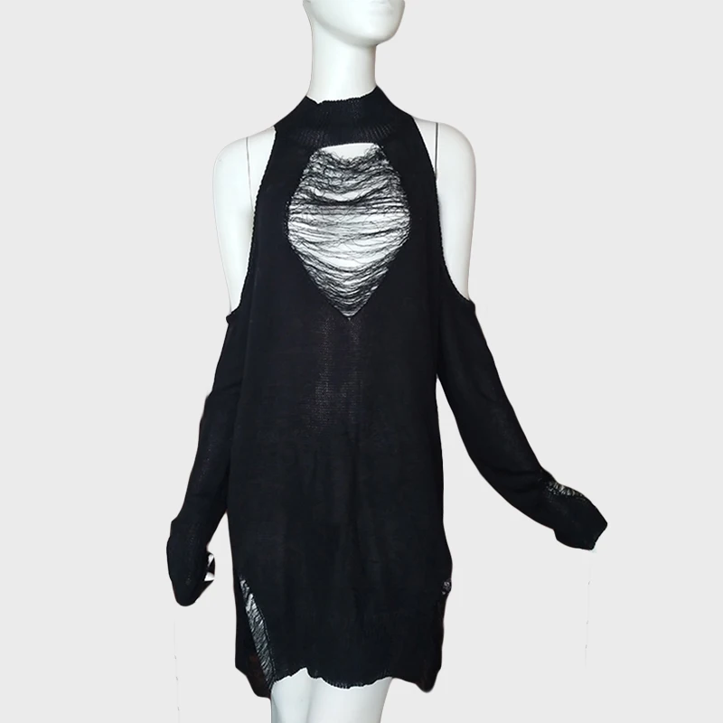 Женский Длинный свитер в готическом стиле, черный тонкий джемпер в стиле панк с открытыми плечами и дырками, пикантный свитер, верх со щелью, крутая вязка