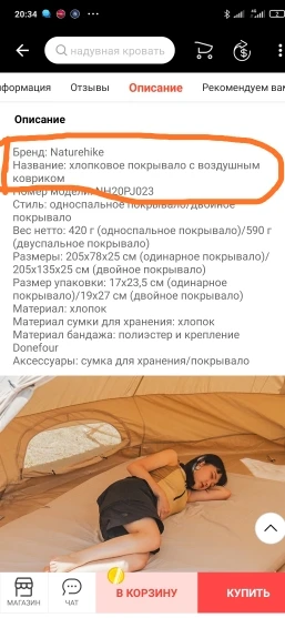 В названии и в описании указан Надувной матрас и хлопковое покрывало, на деле продаётся только покрывало за эти деньги, никакого матраса нет. Открыл спор, Али присудил половину стоимости мне вернуть, продавец был долго не согласен, в доказательств он показал скрин на китайском - английском где указано только покрывало. Возможно это и проблемы с переводом описания в самой программе, но тогда нужно точнее его составлять. Продавец хамил