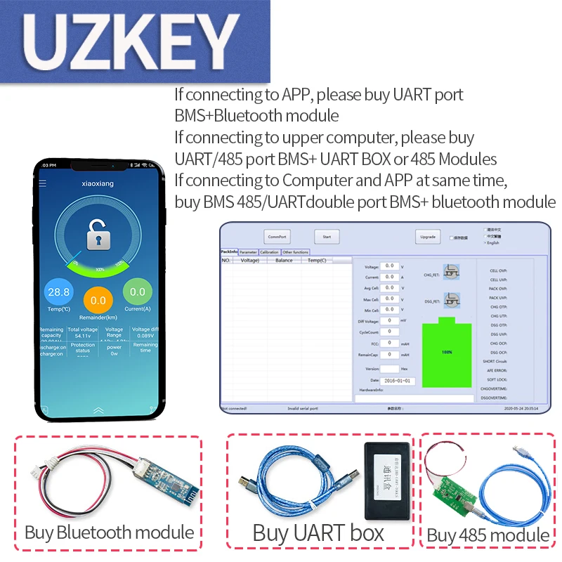 1. Если вам нужно подключить ваш мобильный телефон, вам нужно купить BMS с коммуникационная плата интерфейса UART порт или коммуникационная плата интерфейса UART порт, а затем добавить модуль bluetooth.2. Если вы Подключите компьютер только для чтения данных, вам нужно купить BMS, а затем добавить UART box,3. Примечание: модуль Bluetooth/UART box и ЖК-дисплей не могут быть использованы одновременно, из-за того, что они могут быть подключены только с одним общим портом4. Если вам нужно подключить ПК и мобильный телефон, пожалуйста, купите UART/RS485 double-communication BMS, затем купите модуль Bluetooth и Модуль RS485