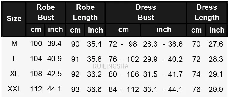 Женский Размер: Размер: M, обхват груди: 100 см, длина халата: 90 см, обхват груди платья: 72-98 см, длина платья: 70 см. (Рекомендуемый вес: 40-50 кг, рост: 150-155 см) Размер: L, обхват груди: 104 см, длина халата: 91 см, обхват груди платья: 76-102 см, длина платья: 72 см. (Рекомендуемый вес: 50-60 кг, рост: 155-160 см) Размер: XL, обхват груди: 108 см, длина халата: 92 см, обхват груди платья: 80-106 см, длина платья: 74 см. (Рекомендуемый вес: 60-70 кг, рост: 160-170 см) Размер: XXL, обхват груди: 112 см, длина халата: 93 см, обхват груди платья: 84-112 см, длина платья: 76 см. (Рекомендуемый вес: 70-80 кг, рост: 170-175 см) Из-за способа измерения допускается погрешность в 1-3 см, спасибо.