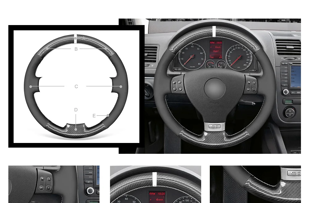 A: белый маркер B + D: черное глянцевое полиуретановое углеродное волокно C: Черная синтетическая замша E: Белые Нити