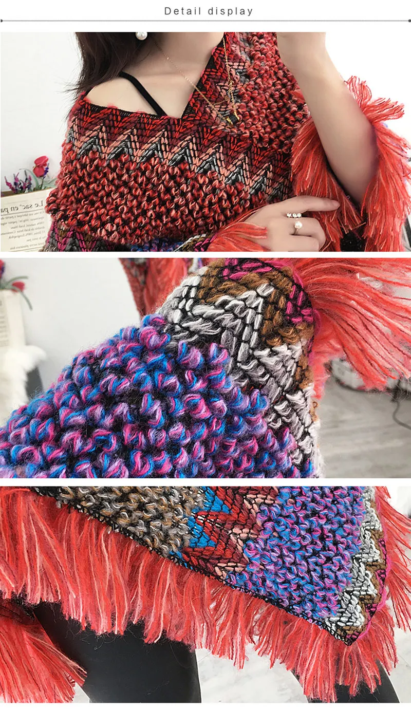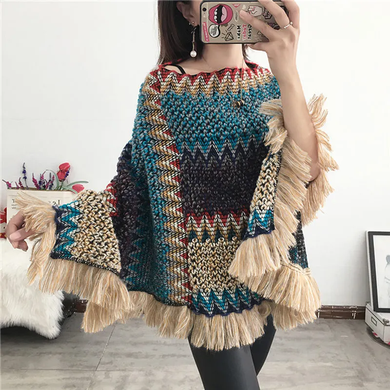 Новый плащ зимнее пончо накидка Женская Мягкая вязаная полосатая шевронная шаль с кисточками богемное пончо echarpe hiver женский кардиган накидки