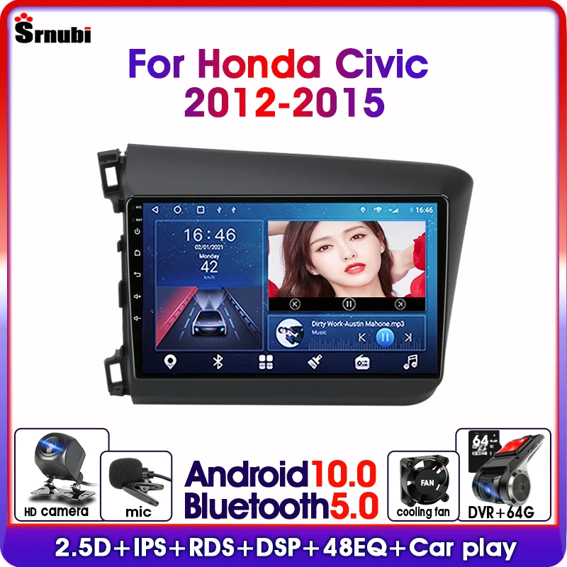 Автомобильный радиоприемник на Android для Honda Civic 2012-2015, 2Din, навигация, мультимедийный видеоплеер, DVD, Carplay, стерео, аудио, головное устройство, динамики
