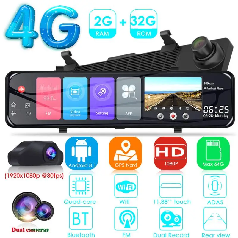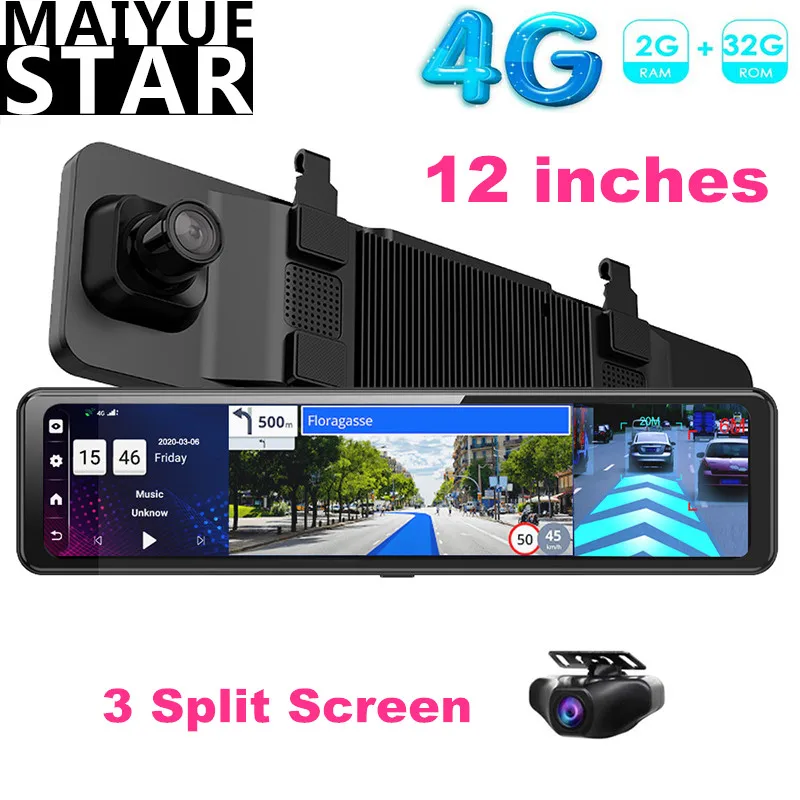 12 дюймов 3 Сплит-экрана автомобильный видеорегистратор 4G Android 8,1 видеорегистратор 2 + 32G FHD 1080P с двумя объективами GPS ADAS WiFi видеорегистратор для вождения
